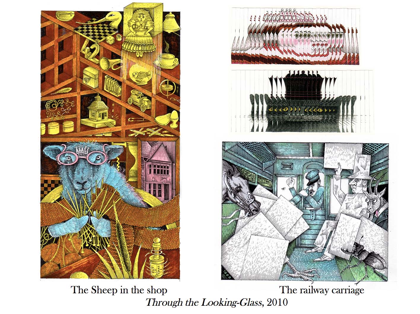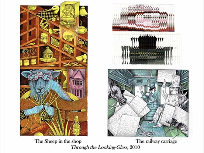 The sheep is knitting in the shop here with the suggestion of the top of a pawn’s head of Alice at the bottom of the picture with a bulrush anticipating what happens next when she is later rowed down a river by Alice.