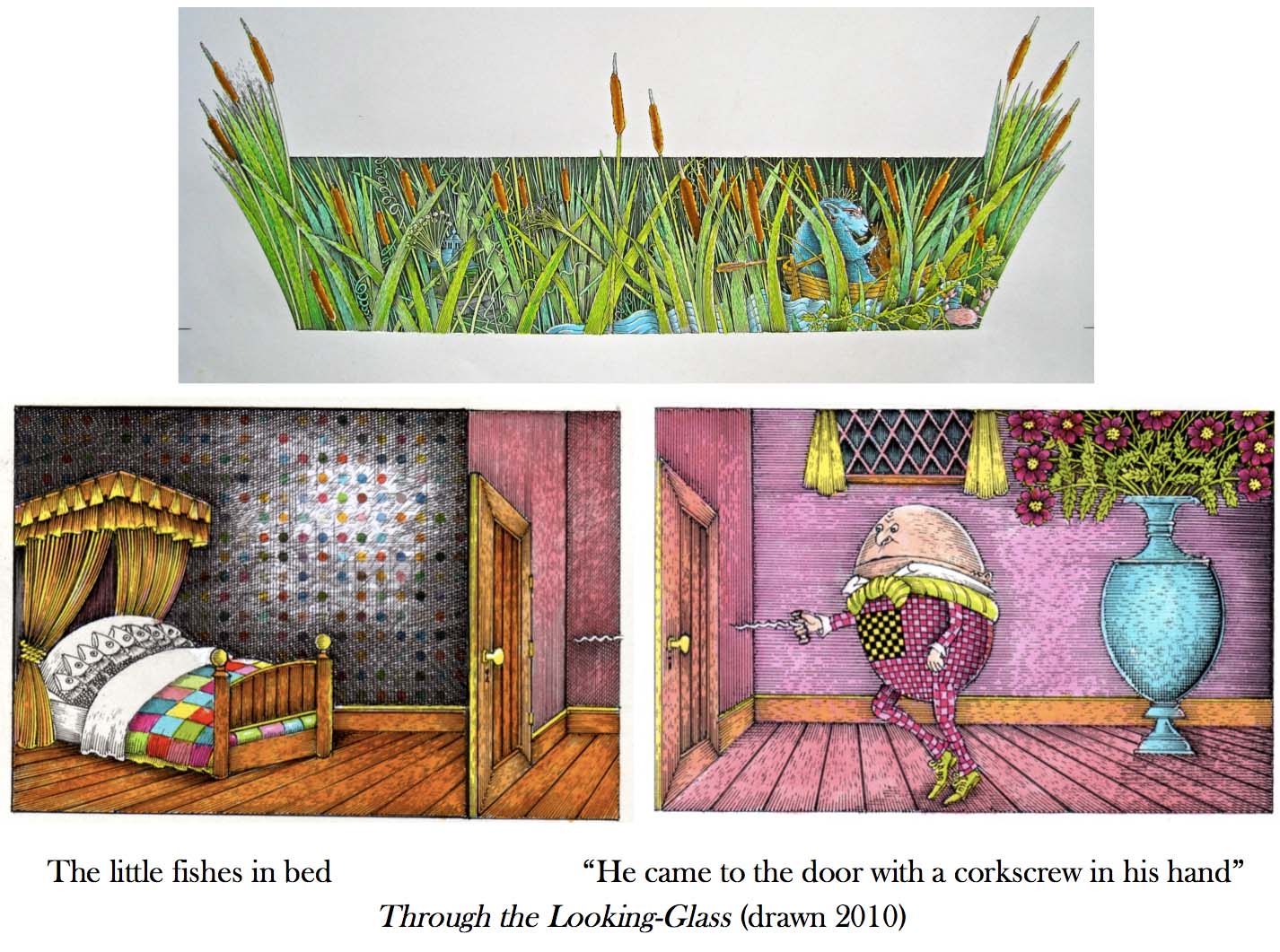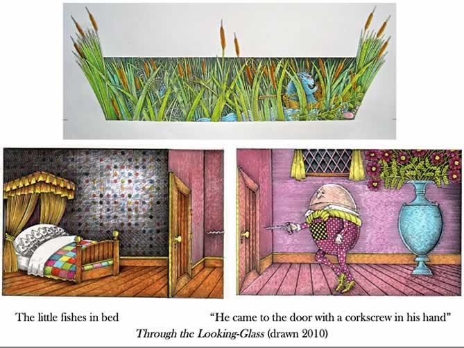 Below are two illustrations separated for quite a distance in the actual book but brought together here since it is something of a riddle in the book - who it was who was handling that corkscrew to open the door. The wallpaper in the fishes’ bedroom looks suspiciously like one of those Damian Hirst ‘dot’ paintings. |