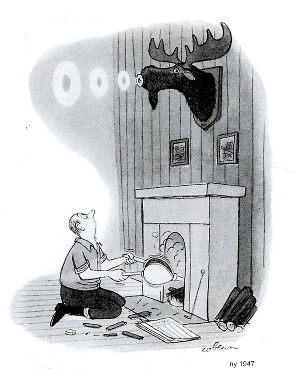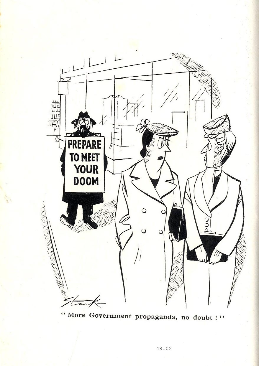 Now you have reached the core of it all. I suspect that the eager cartoonist may start his/her day with reflections on the humour of the Professions. or perhaps a cheap slap at our 'Foreign Friends'. All effective pornography must identify the narrative milieu with clear indications of uniforms, which is why chefs, policemen and firemen have sex while retaining their hats. Similarly, the cartoon's humorous proposition must leave nothing to the imagination. The surgery must make it clear whether the dominant force is an MD, a psychiatrist, an optician or a dentist. As Emett has identified, the diploma on the wall tells all, if in a heavy handed way. The identification of nationality provides us with simple fare, and even simpler jokes, the Mexican's hat, the Australian's deployment of corks, the Scotsman's kilt, the American's stetson. The challenge comes with the depiction of Belgians, New Zealanders and Serbians. Aliens from Outer Space are easily drawn as little chaps with cranial aerials before Roswell, or as sloe eyed whippets threafter. The correspondence between life and art in drawing the Flying Saucer tends to help undermine the credibility of witness sitings. It is clear the slack jawed truck driver had seen in the sky what was first seen in his book of saucy cartoons. |
