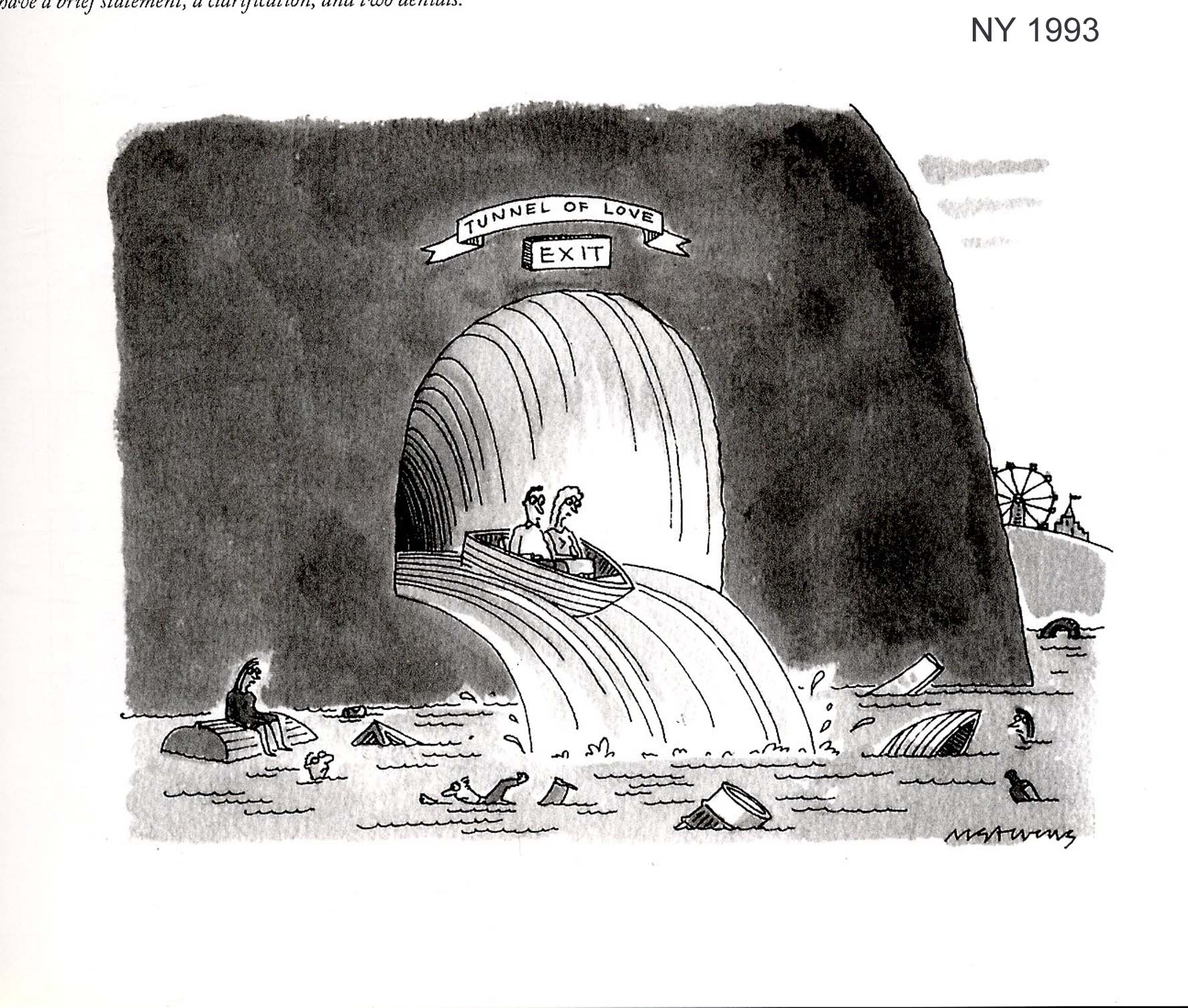 In the Entertainment section are the most recognisable of the pictorial schemata, reassuring even the most nervous reader - that all was right with the world - that knife throwers missed, that the Tower of Pisa still leaned, that drunks held rubber cigarettes and had tousled hair. In the post-war period, whenever British cartoonists were stumped for an idea, their default was the artist's studio with nude models, or the sculptor's studio with Moore/Hepworth lumps with holes. The Bohemian was so easy to draw - all beard and sweater. Fairs and Fetes. In terms of familiar sexual imagery, the Tunnel of Love seldom failed, any offending grappling confined to the spaces behind the Tunnel Opening. A variant was of course The Hall of Mirrors. Speak your Weight machines, Ring the Bell machines and Hoopla stalls also feature. |