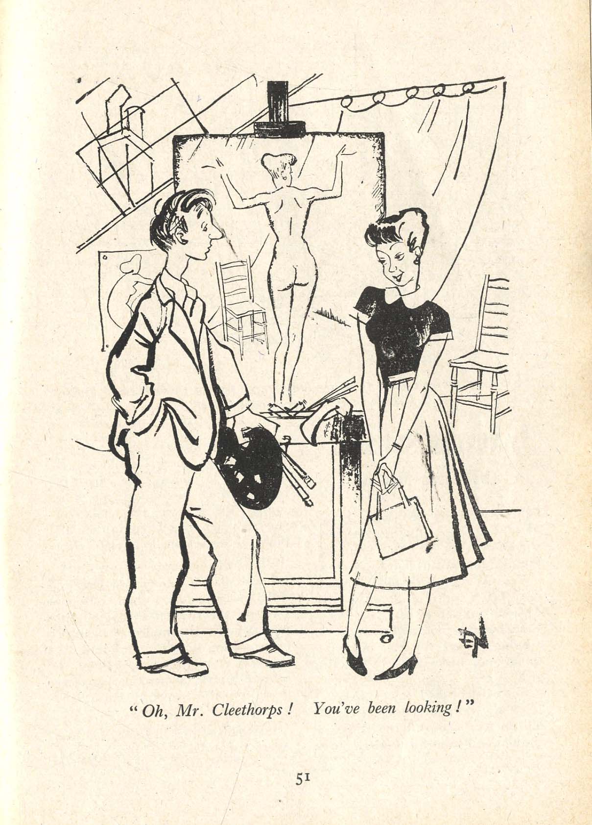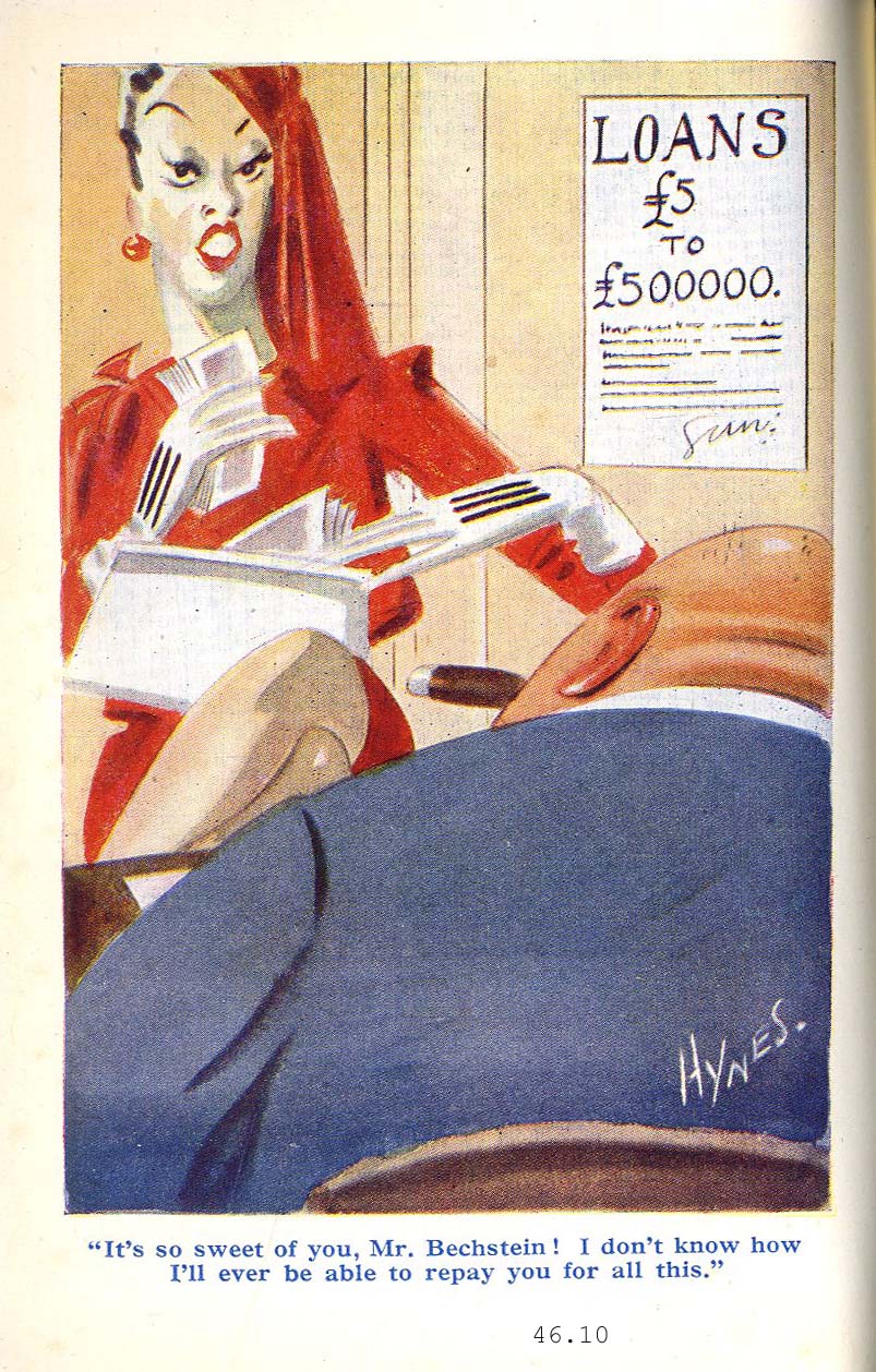 Given the income generating attractions of the smutty cartoon, artists were constantly storing up potential subject matter. There could be little emphasis on the anatomical can be little treament in the mass circulation magazines of the day. Instead the field is dominated by the Mythic (Adam and Eve, Samson and Delilah) and the Situational (Newly Wed, Toff and Tart, Idle Fantasies). There was too much to include so I am trying to be highly selective here - no, really. |