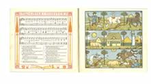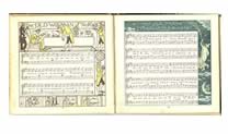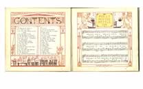 | This is the book in its entirety, page size 17 x 19cms. The sequence of pages after the board begins with a densely patterned endpaper (see last scan here) and then takes a leisurely journey through a blank double page marked only with a yellow decorative roundel before the half title, a page with roundels. The we turn to the titlepage with full page frontespiece. There is then a double page dedication and this is followed by a contents page (left) before the first decorated musical score appears. |