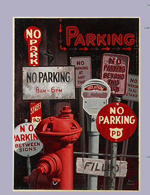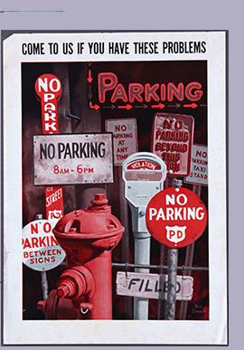 Ken Davies (1925-2017) A commercial project for Ellis Magazine, an annual publication for The Ellis School in Pittsburgh. The list of publications has an earliest date of 2006. Presuming that is the earliest publication date this project probably comes from earlier in the publication’s history, presumably 2006-2010. The topic is likely directed at the student body to help them find parking near the school. A reproduction is marked “Neeley Associates." The original painting is accompanied by: 1) A mounted reproduction with the agency name as shown above. 2) An offset print (perhaps posted around campus) titled above the reproduction, “Come to us if you have these problems” 3) Two transfer drawings on tracing paper. The first is sized to the painting with sheet dimensions of 477 x 347. The second is a fragmentary sheet for one small segment of the drawing measuring 105 x 190 |