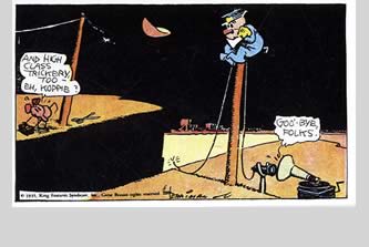 Forget the ingenious narratives of Love Frustrated, Flying Bricks and Homicidal Mice. Herriman creates highly inventive compositions, flirting with the occasional proscenium arch and front of stage lighting, with mountain ranges that change shape in adjacent frames and eccentric stretches of desert and wasteland. Occasionally there is a homely interior.