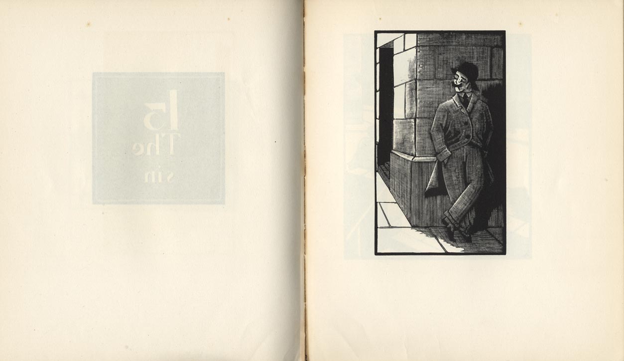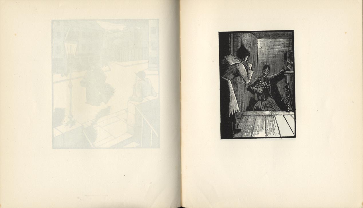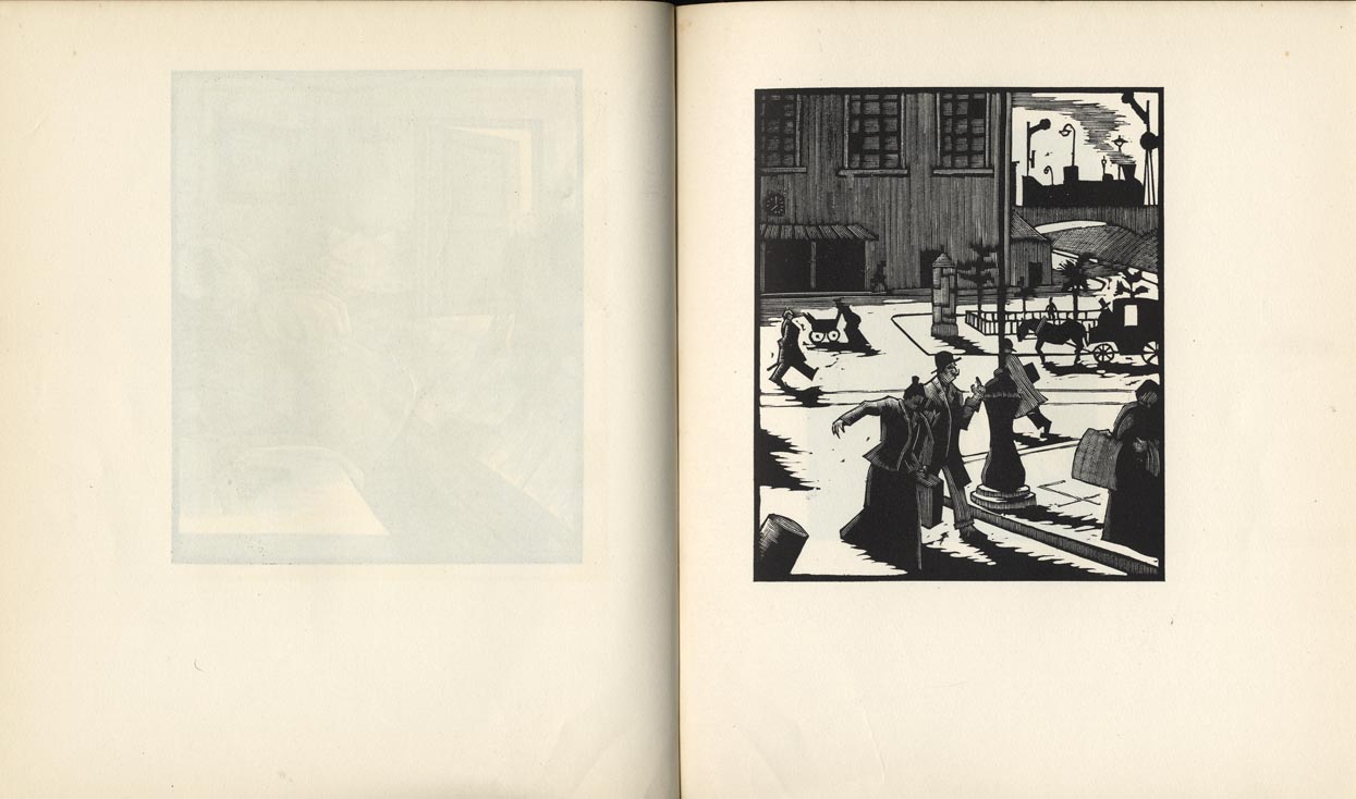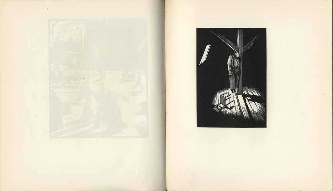 My edition was published by Albert Marriott, London 1930. Nuckel is situated between Masereel's gritty stylised social attack, and Lynd Ward's sweet slinky narratives. Nuckel has an unerring sklill in choosing key frames and making the Point of View really varied and telling in the unfolding off the story. He uses costume and drawing to identify characters with little sense of confusion for the reader.