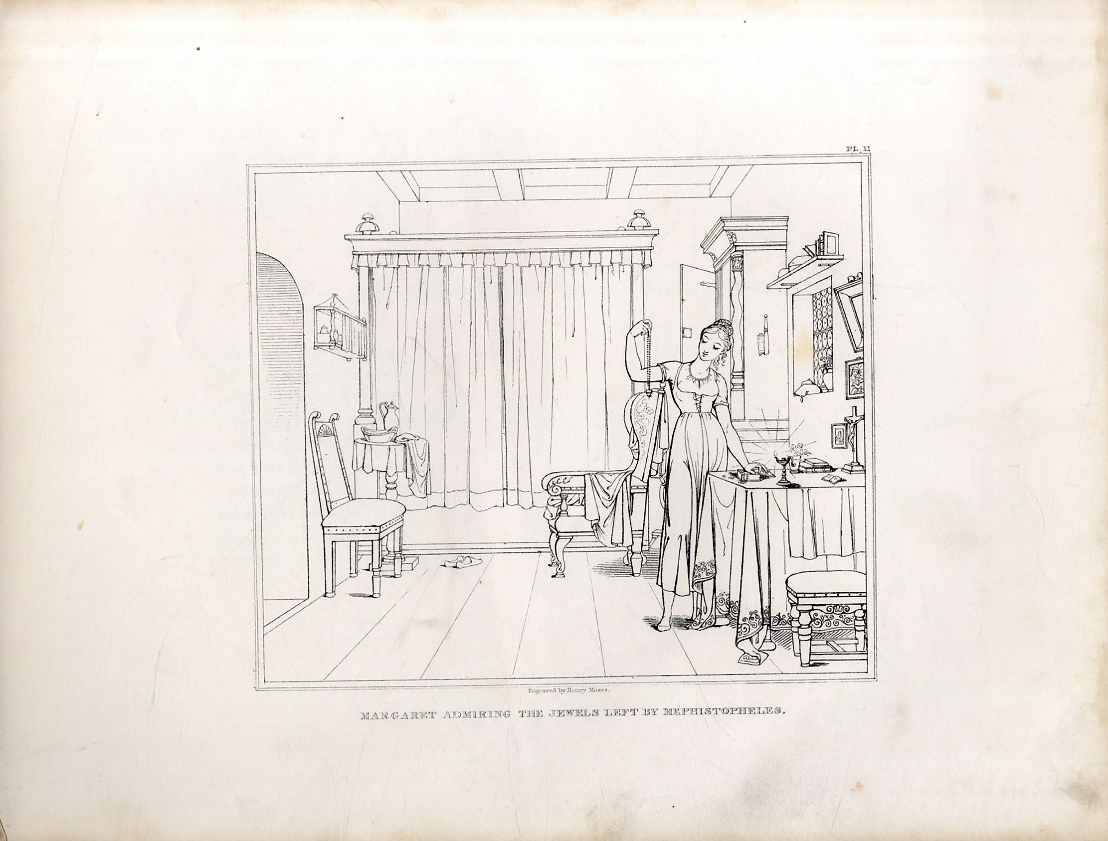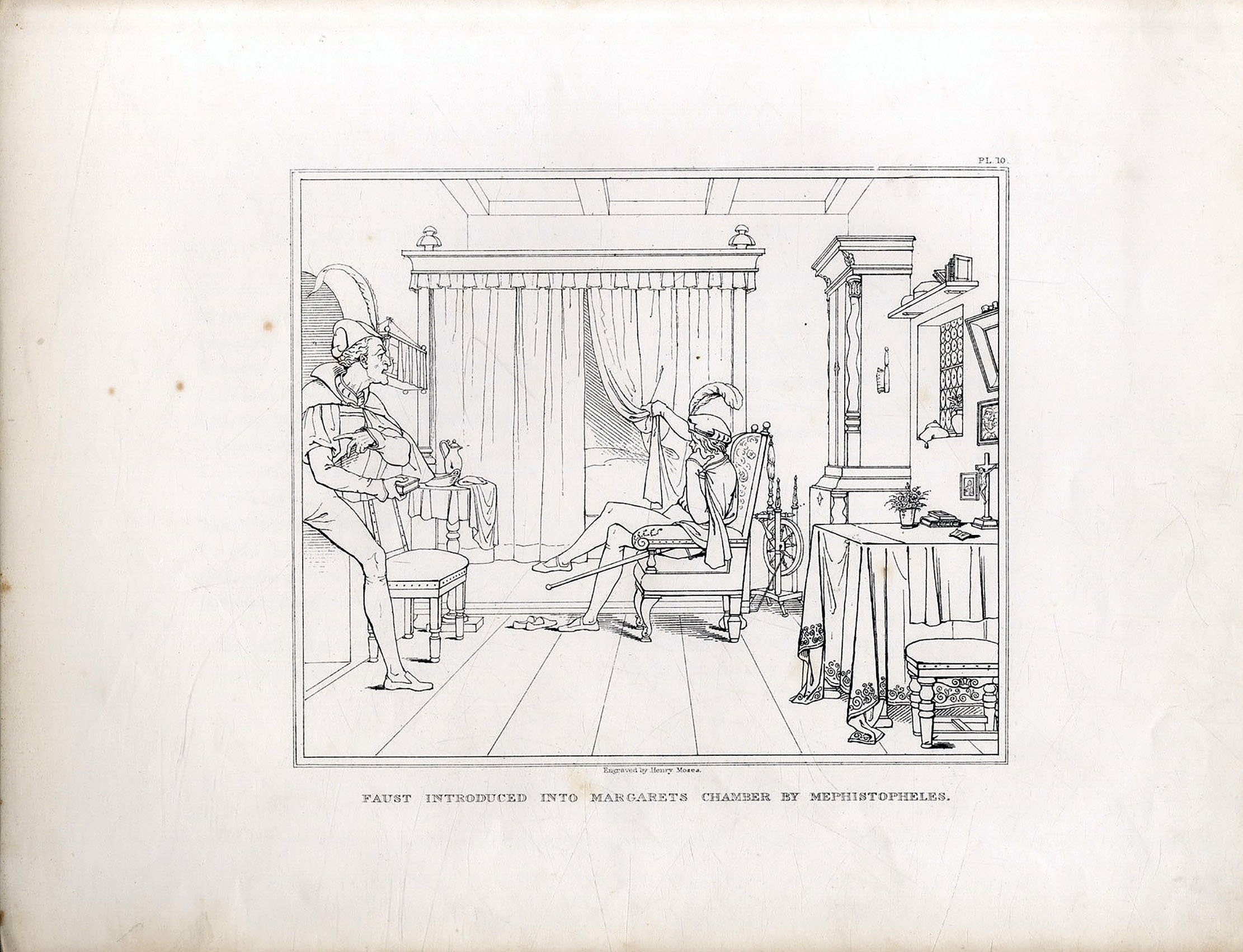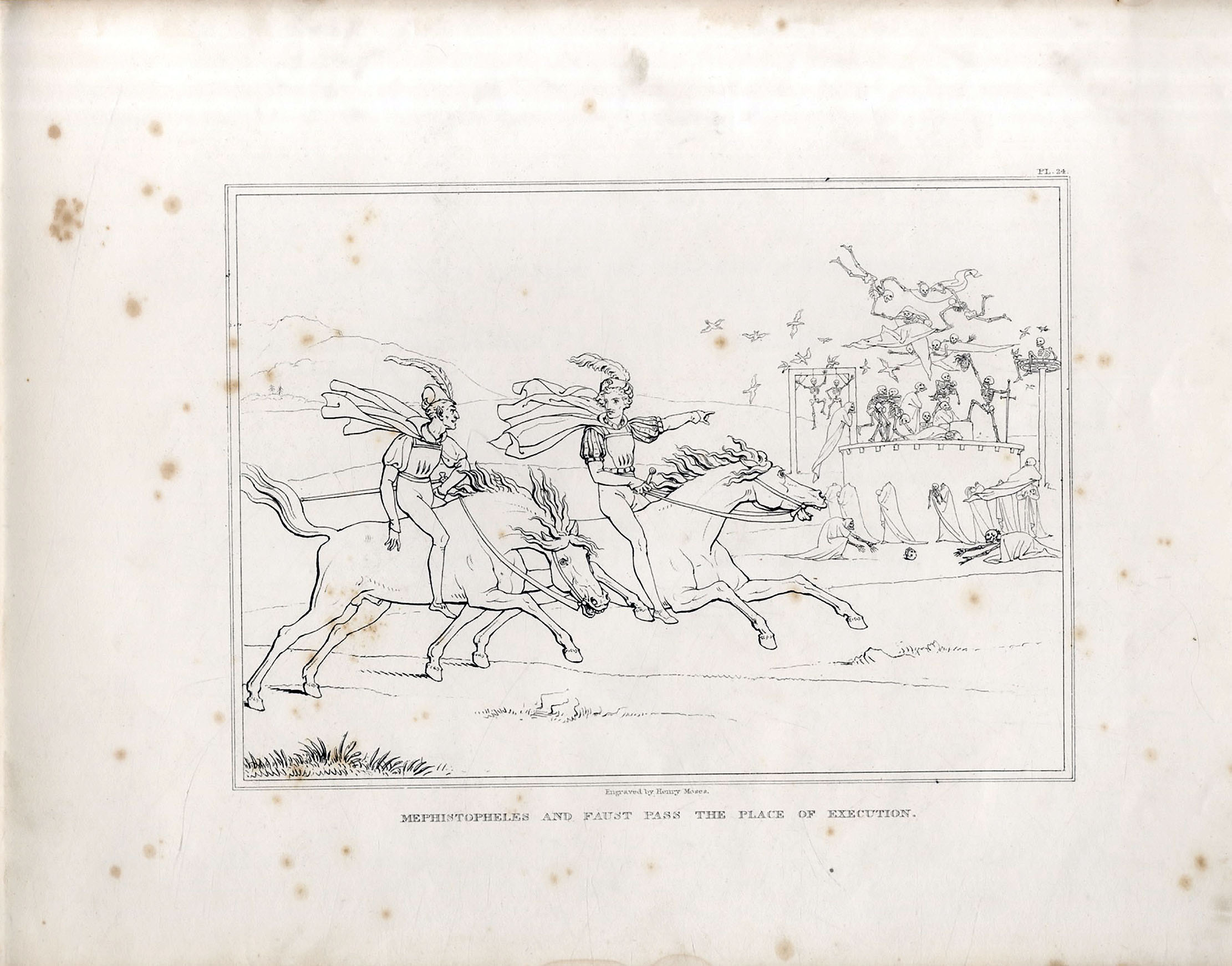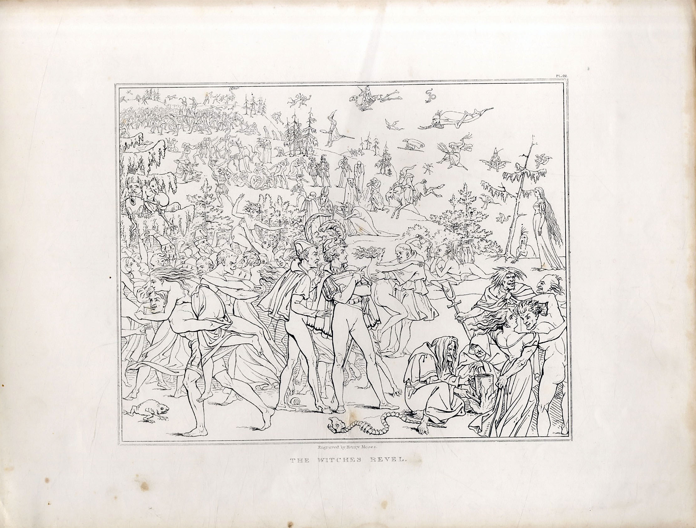 There is something both compelling and awful about Retzsch. People take against him because of the unremitting, almost industrial, line of his interpretations. For me this a clear attraction in my long campaign to discredit expressionist gestures of a sloppy type. But you can see the huge influence he had on European art, not least the Pre-Raphaelites before 1855, in the depiction of interiors and accessories. The repetition of identical locations with a variations in the deployment of figures has its charm. If I remember correctly the admirable Will Vaughan discovered that, for the English edition the generosity of the Codpieces was reduced to sensible proportions. Odd for a tale with its fair share of lust and demescence. I always look out for the suppressed anal impulses in crowd scenes and phantasmagoria. In revelry and controlled orgies we approach a cusp of the disreputable. Here monsters' tails which under normal circumstances flow from the buttocks, curl back through the legs to become agile penises. Saucy old Moritz. |