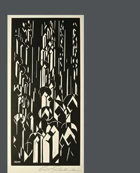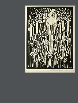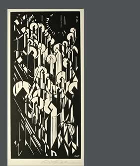 Max Thalmann (1890-1945) trained as a bookbinder under Henry Van De Velde at Weimar, and then became his assistant. He taught briefly at the Bauhaus before 1922/3 going to America, an experience that inspired his print portfolio Amerika in Holzschnitt. Der Dom plays inventively on the theme of figures and interiors, with spiritual evocations of Gothic architecture, arch, window and aisle in a visual language familiar to Thalmann's generation of Expressionist artists. The sun flares in a variant on the Rose Window. A comparative image might be Feininger's design for the 1919 Bauhaus manifesto. Thalmann's repertoire of form is almost a musical synthesios of black and white in the ways we see in Kupka. It may be my misreading but there seems a proliferation of cowls and anonymous figures in procession. In the Amerika portfolio the shapes take on a more Cubic formulation without the sinuous shapes of the arch mouldings that occasionally evoke natural growth such as tree limbs. In Amerika the mechanical has come to dominate the composition. G.F.Hartlaub was a writer and art historian who specialised in writing about contemporary art, those associated with Expressionism and is credited with the generation of the critical term Die Neue Sachlichkeit in 1923. Thalmann's career was however not spent as an exhibiting artist but as a graphic designer. most notably for Diederichs of Jena. See how confidently he deploys letterfoms in the titlpage to the portfolio.