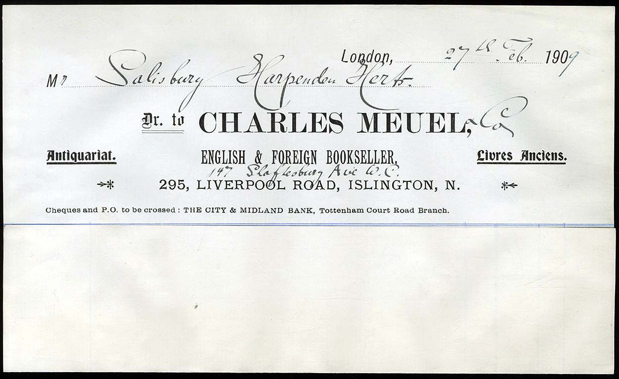 | A CUSTOMER'S RECEIPT FROM MEUEL'S BOOKSHOP ISLINGTON 1909 |