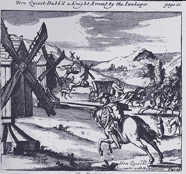 windmills, which Don Quixote confuses for giants; a lady on her way to