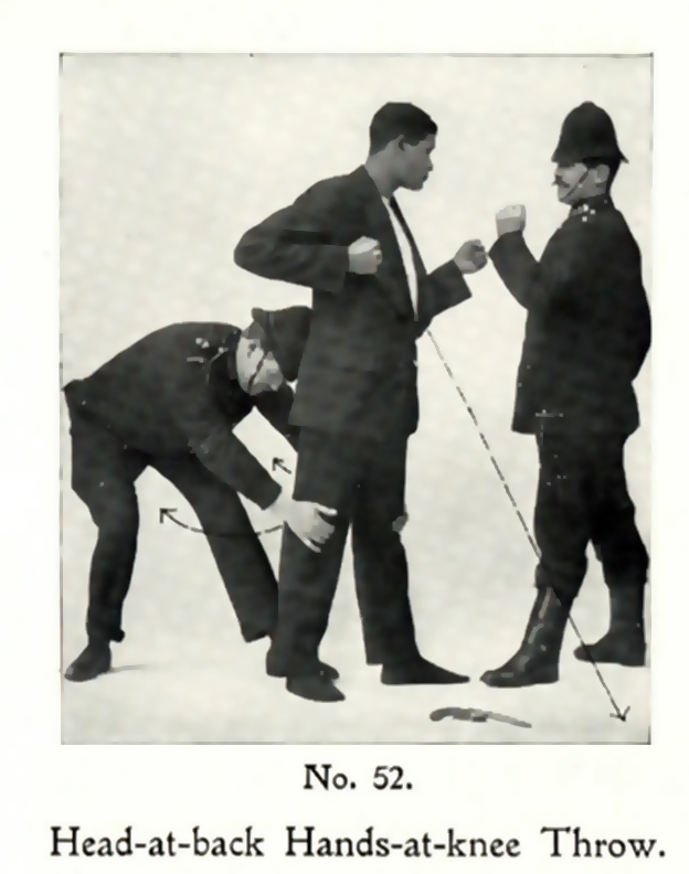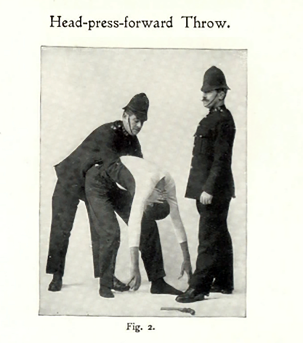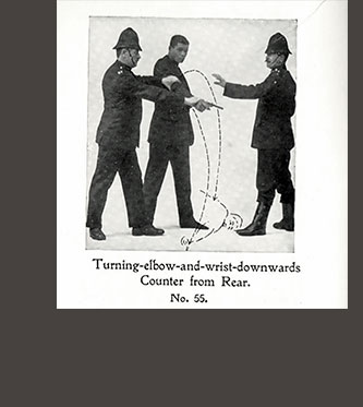 Bruce Sutherland was pre-eminent among Scottish self defence experts. His moustache alone struck terror into miscreants, and for the purposes of training films and manuals, he is always the one in snappy shorts. But mostly the Manual (c1915) features two sturdy policemen with helmets and jackets welded onto their steely frames, who paste the living daylights out of two noticeably foreign models, one a black, tough cove and the other a Chinese willowy youth of immense inscrutability. No stop and search here but grab and incapacitate. Later in the book, a scallywag has made the great error of picking on someone who looks like Margaret Rutherford, and who seems to immediately engage him in an erotic dance. How Francis Bacon would have been aroused by the close contact clinches in this book. He always had a soft spot for a chap in uniform. I do not wish to undermine its relevance today when dealing with Drunks, Pirates and Academic Ne-er-do-wells. Buy yourself a giant moustache and close hugging shorts and you too can clear the streets of Portsmouth, sinister yet cheery, Love on one hand, but Hate on the other. The VTS management would like to thank David Monkton for access to this remarkable publication. |