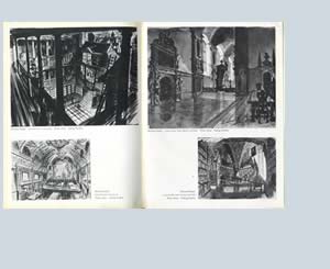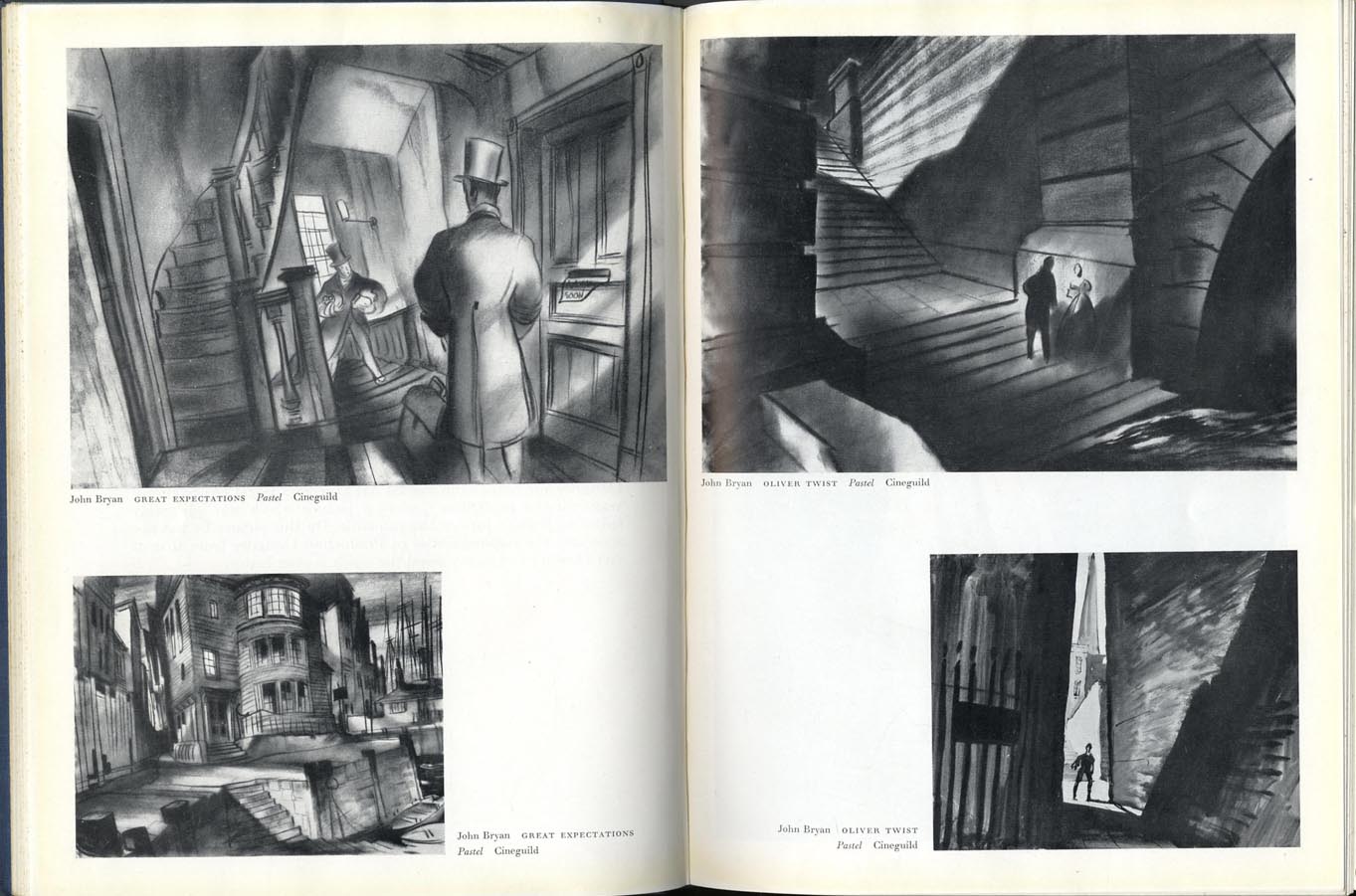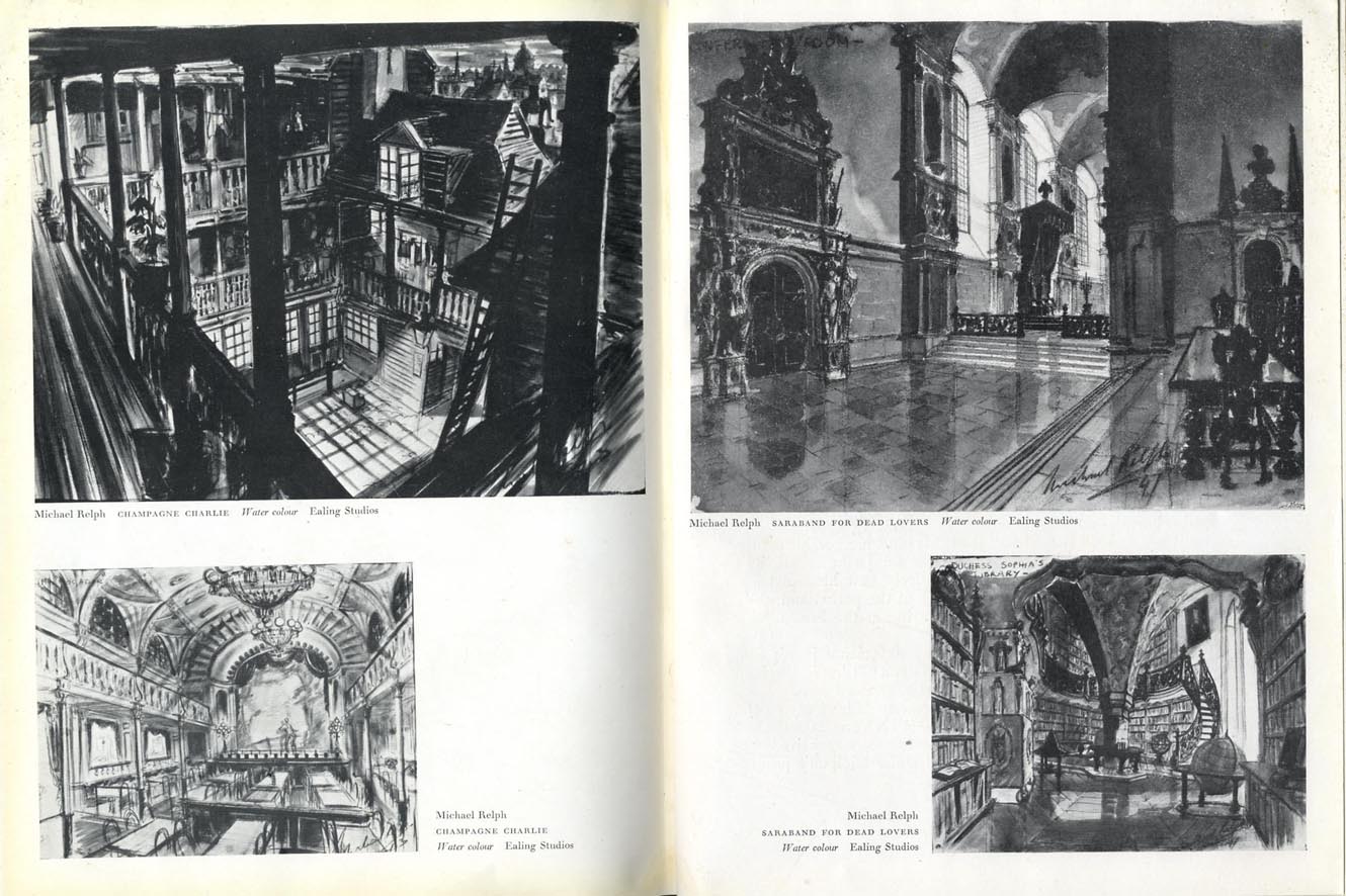 row 01 Oliver Messel for Caeser and Cleopatra, contents page, John Bryan Oliver Twist and Great Expectations. row 02 Edward Carrick, Fires were started,, Captain Boycott, Heine Heckroth Red Shoes. row 03 Lawrence Irving, The Man in the Iron Mask, The Doctor's Dilemma. row 04 Lawrence Irving, Pygmalion, Uncle Silas, Alfred Junge Jew Suss A Matter of Life and Death, Colonel Blimp. row 05 Tom Morahan, Jamaica Inn, Michael Relph, Saraband for Dead Lovers, Champagne Charlie.