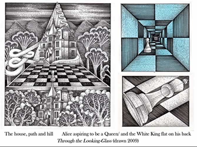 On the top right here we can see Alice aspiring to be a Queen. And below the White King (having fallen flat on his back). |
