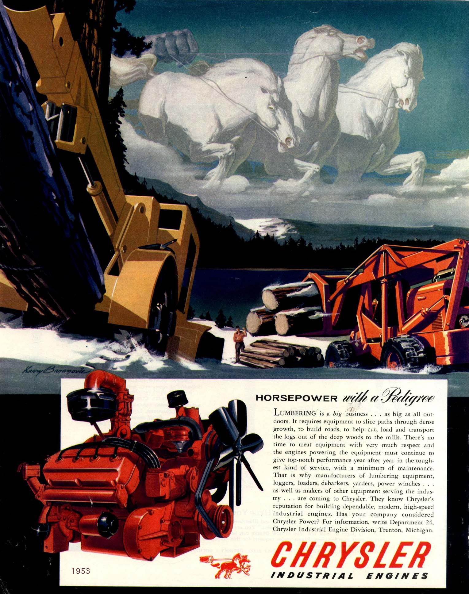 His airbrush skills and sense of controlled Baroque design are highly characteristic with a density of surface few other artists could emulate. His compositional facility allowed him to shift easily from one dimension to another with never a seam showing. It is remarkable that the product is represented in the public's mind with dark, storm tossed imagery. The beasts are reined in, but such is their power, there is no guarantee they will not tear the place apart. Not what Chrysler Industrial Engines intended surely.