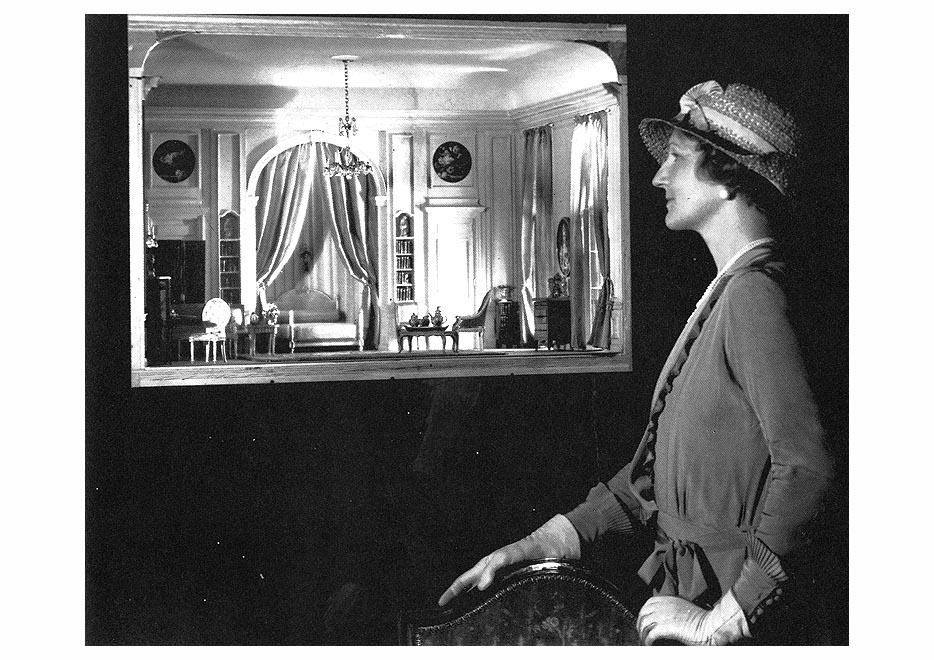 Three people look at the Thorne Miniature Rooms Chicago. The Mannequin surveys the Thorne Room An architect surveys his model |