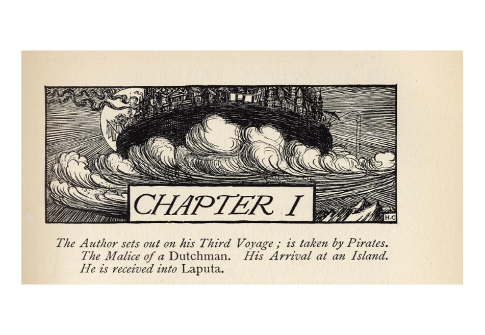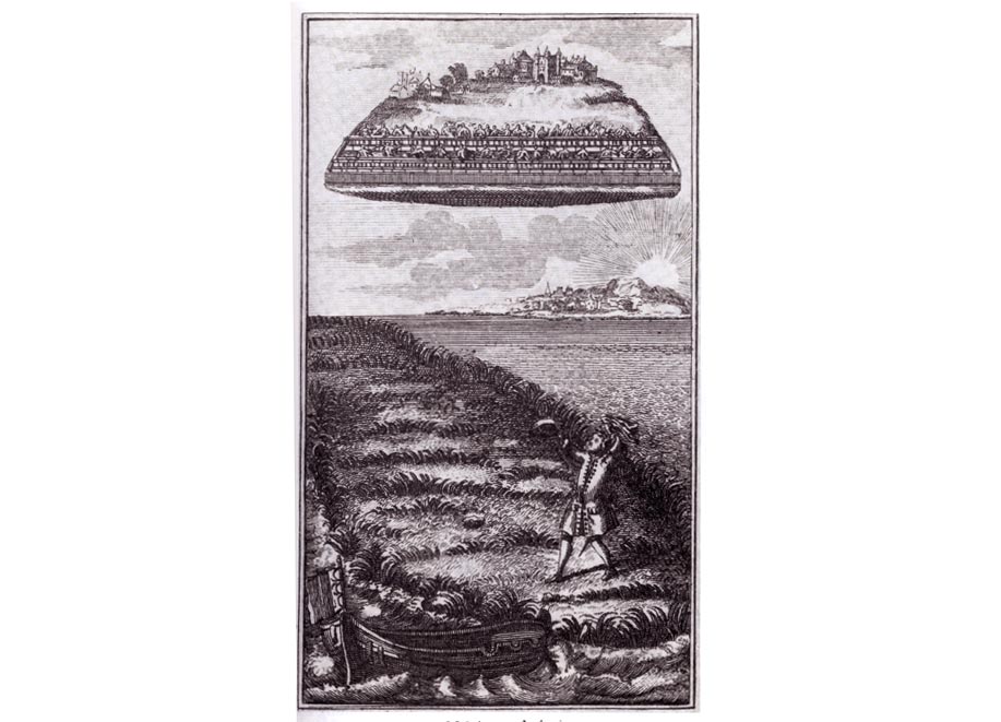 | Laputa, Gulliver aboard the Floatinng island. That the King could punish rebellion by hovering over the rebellious town by depriving it of rain and sun. "And if the crime deserve it, they are the same time pelted from above with great stones against which they have no defence... if they still continue obstinate,, or offer to raise insurrections; he proceeds to the last remedy, by letting the island drop directly on their heads, which makes a universal destruction of houses and men." Chapter Five. |