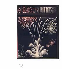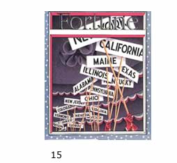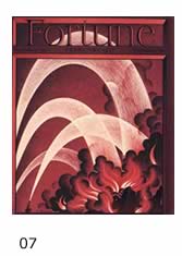 01 January 1937. " When the first sketch was approved, I was given $5.00 to buy a bottle of champagne and a few sample glasses, these to help me get the effervescent and bubbly look and glass brilliance. On finishing I felt I deserved a drink, but the contents had gone flat - so, down the drain. I like the receding curve of the glasses and good color match. It is bold, simple and says 'whoopie'....." 02 December 1934. "When my wife and I first saw this issue displayed at Brentano's book shop we groaned. The original blues were loused up. The frame blue was much deeper making the sky recede with a rich night glow. In fact the effect is an overall single color. I should have been allowed, as with the tickertape case, to exert some command over the ink matchers regardless of their objections to interference. The same vexing problem here of definition - especially the tiny dots where they clogged. In spite of everything I think it is a good design and I found the work very pleasant." 03 October 1939 "This was one of the few not done in gouache. I used Japanese wood-grain papers as paste-up which was fun doing. It was used for all kinds of FORTUNE promotion. I have the original and am waiting for its disintegration." 04 September 1937. "My first full full-color cover without the frame, done mostly with airbrush. The stacks, researched from FORTUNE files, had to be authentic. They stacked nicely in my design and clearly introduced the contents within. Colors restricted by the obvious. Offset." 05 May 1937. "An effective design and pleasing color. The billboard rendering received plaudits from the advertising people for its structural correctness. No great achievement - it was based on authentic sources." 06 June 1937. "Visually concocted with many revised tracings. The quotations copied from real figures. We had trouble with the ink people. The first proofs were terrible, with a poisonous velvet background. I was sent to help the color mixers get the desired hue. My presence was not cordially received (professional jealousy). I suggested adding black, and more black, to their horror, but it worked. I call this one the 'noodle cover'..." 07 February 1937. "I was always intrigued by water displays, even when sanitation men flushed the streets. Admittedly, firefighting streams are less graceful, but artistic licence makes for a rhythmic design. The use of cross-hatch is here fully exploited and the colors suitable to the occasion. One of my favorites. Offset.." 08 December 1935. "The problem here - as in other cases - was to convincingly suggest the glamor of jewellery under artificial light in flat colors. This again might have profited with the use of airbrush. The greens did not match any color swatches - thanks to the unimaginative ink people. But it's festive." 09 FEBRUARY 1940 10 December 1933. "My second cover - an easy one, and seasonally appropriate. Probably meant for some other magazine. I had had it in limbo and redesigned it for FORTUNE. This kind of transplanting happens now and then. The ditch digging was a rejected idea for the NEW YORKER." 11 September 1933. "I have a special affection for this - my first FORTUNE cover, and the beginning of a memorable period. The equestrian treatment might have been better handled. However one should not look a gifthorse in the mouth, or something." 12 May 1941 "This was a challenge in perspective, done the hard way - trial and error. The diminishing tents had to line up true. I wanted to suggest the congested regimentation and drab monotony of military camp life. In the spirit of monotony I made endless tracings and revisions before the final result. Good repro in offset." 13 July 1936. " A natural for the 4th. The trick here as with the others was to give the feeling, within the technical limitations of flat colour, of luminosity and sparkle. Here of all places, use of the airbrush would have been justified. All things considered,it turned out satisfactorily. As with all letterpress/gravure printing, the pressure of the plates tends to squeeze the ink a fraction causing a slight loss of definition." 14 JULY 1934 "I have an old sketch of a cover for the FORTUNE Italian issue of July 1934. The design was rejected in favor of my other submission, which was used. " This design is a typical Petruccelli, with cross hatch and stipple. In Mount Tabor Tony told me that the satirical depiction of Mussolini in this design was rejected by the editorial staff because they knew that it would not have gone down at all well with Henry Luce, owner of TIME/LIFE who at the time was a supporter of the Italian Fascist leader. 15 Design c 1938, used for the poster for the exhibition FORTUNE, the Visual Achievements of FORTUNE magazine". The separations for the printed image were prepared in New Jersey and printed by Mel Clarke at the Norwich School of Art for the exhibition FORTUNE's America at the University of East Anglia in 1985. |