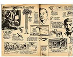 One of the unsung Masters of the Narrative, Ripley's Believe it or Not provided hours of happy amusement for a credulous public. Sensational headlines often cloak a play on words that renders the fact pointless or banal. I have a great liking for this style of confident, big shout lettering. The drawing too exerts a sort of homogeneity where cosmic disasters exist in the same graphic scale as three legged chickens and Henry VIII's codpiece.