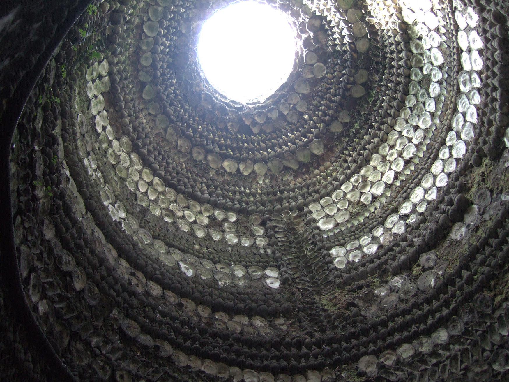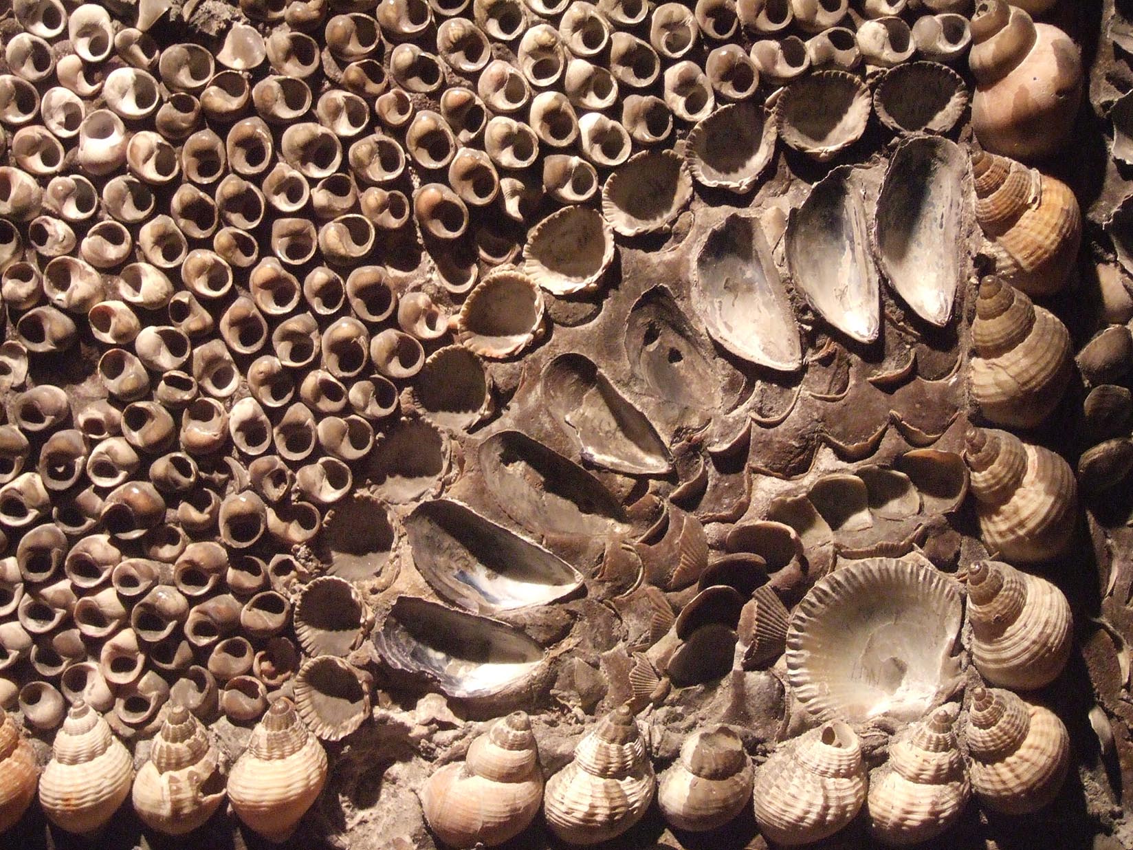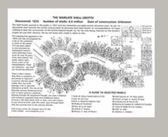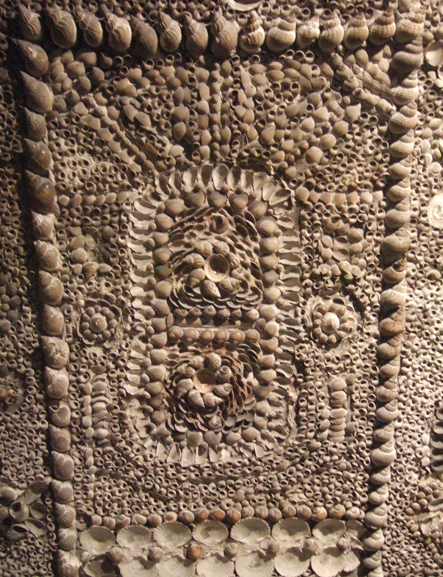The Grotto was first opened to the public in 1837, having been 'discovered' two years previously. At its heart is a central room with an encrusted tump that could be interpreted as an altar, approached down a passage and through a rotunda. The passages are qround eight feet high, and the length of the journey around eighty feet. In the central room an exit to the street has been boarded up. The surfaces of the Grotto are decorated with panels of shells deployed in all manner of ingenious patterns, always constrained within simple, clear frames, sinuous, mathematical and almost exclusively, like all Shell Grottos, symmetrical. The ground plan of the Grotto is in itself a magnificent conceit, with its polyp-like profile, and inadvertent resemblance to vegtabular or submarine extrusions. The occurence of a seance in the central room (see above) was an attempt to tap into the undoubted spookiness of the space. The Grotto is supported by English Heritage but is still in private hands. Touchingly there were attempts to clean the shells with their sticky patina of soot, but the trial shell disintegrated once the soot had been removed. The brochure with its complex iconographic programme is a useful distillation of all the fashionable mumbo-jumbo of our age, with its breathless celebration of the Universal, anthropomorphic scatterings of universal turtles and penises. There are many other Shell Grottos most notably the elegant example at Isola Bella, Lake Maggiore conceived in 1685. Perhaps the Margate Grotto dates from around the time of Alexander Pope's grotto in Twickenham.Other British examples that deserve mention are in Pontpool and at East Molesey. But Margate has the most ambitious and determined of surface decoration. It seemed to me to be the same sort of manufacturing philosophy as The House of Facteur Cheval, where daily contributions to the overall task were brought home at the end of the working day and added without inspiration or question to the overall programme, sometimes by the artisan and also perhaps by his uncomplaining children. The first owner of the Margate site had five children and I could well imagine them pressed into service as well as being sworn to secrey. My mother Marjorie, in her later years, covered plates, jugs, bottles, lamps and even our main fireplace with mussels, winkles and other shells bought by the sackfull and set in a sort of fast setting yellow curd. My father warned me never to sleep in her presence, lest I wake up encrusted. It is a common impulse in those with time on their hands. The antiquary Albertus Seba had a more inventive approach to Shell Design and patterning , but then he too had time on his hands. |