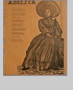 ROW ONE,Alberto Beltrán, "A correr gallinas..." 1952 Linoleum cut with type. Good impression on typical fine colored paper. Image dimensions: 5.6" x 7.2" Sheet dimensions: 12.0" x 7.9" Description:A depiction of a seated man with chickens in the background.As the title suggests, Lombarde Toledano's competitor in the race is, in a sense, a running coward. Unknown artist, "Adelita" circa 1950-55 Linoleum cut Good impression on typical fine colored paper Image dimensions: 11.0" x 8.4" Sheet dimensions: 11.0" x 9.2" Description:A depiction of a female fighter with sombrero and rifle. Jesús Escobedo(?) "Campesino de Nayarit..."1942 Zincograph (metal relief print from a linoleum cut or drawing) with type. Bears signature at LR "Escobedo." Excellent impression on typical fine colored paper. Image dimensions: 6.6" x 5.7" Sheet dimensions: 9.1" x 13.2" Description:A flyer stating the minimum price that a farmer should receive for his corn in the state of Nayarit.The image shows an indignant farmer disregarding a buyer who appears to offer about a third of what the farmer should get. |