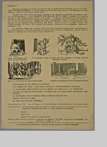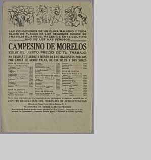 ROW TWO, José Chávez Morado "Campesino de Guanajuato..." 1942 Zincograph (metal relief print from a linoleum cut or drawing) with type. Bears name on verso, LR, in graphite (Chavez-Morado.) Paper/impression quality: Excellent impression on typical fine colored paper. Image dimensions: 6.7" x 7.7" Sheet dimensions:13.1" x 9.1" Reference: Prignitz, related works on page 336 Description:A flyer stating the minimum price that a farmer should receive for his wheat in the state of Guanajuato.The image shows hard working farmers wondering why they are taken advantage of.The government provides a fair set price and the greedy buyer is thrown out of town. José Chávez Morado"Campesino de Coahuila..." 1942 Zincograph (metal relief print from a linoleum cut or drawing) with type. Edition: Unknown Inscriptions/Annotations: Bears signature at LR "Chavez-Morado" Paper/impression quality: Excellent impression on typical fine colored paper. Image dimensions: 6.9" x 7.9" Sheet dimensions:13.4" x 9.1" Reference: Prignitz, page 336 Description:A flyer stating the minimum price that a farmer should receive for his wheat in the state of Coahuila.The image consists of a series of nine panels helping to explain to the farmer how his crop is harvested, used and exploited. José Chávez Morado Title:"Campesino de Jalisco..." 1942 Zincograph (metal relief print from a linoleum cut or drawing) with type. Paper/impression quality: Excellent impression on typical fine colored paper. Image dimensions: 7.0" x 7.9" Sheet dimensions:13.2" x 9.1"Reference:TGPpr, 336.TGPdoce, 147. Description:A flyer stating the minimum price that a farmer should receive for his wheat in the state of Jalisco.The illustration consists of a series of images showing the benefits of using the set prices established by the state. Unknown artist, "Campesino de Morelos..." 1942 Zincograph (metal relief print from a linoleum cut or drawing) with type. Edition: Unknown Inscriptions/Annotations: None Paper/impression quality: Excellent impression on typical fine colored paper. Image dimensions: 2.2" x 8.2" Sheet dimensions:13.4" x 9.2" Prignitz number:Apparently not listed in Prignitz Reference: Prignitz, related series on page 336.TGPdoce, 147. Description:A flyer stating the minimum price that a farmer should receive for his rice in the state of Morelos.The image has three frames showing planting, being the victim of insects and the harvest. |