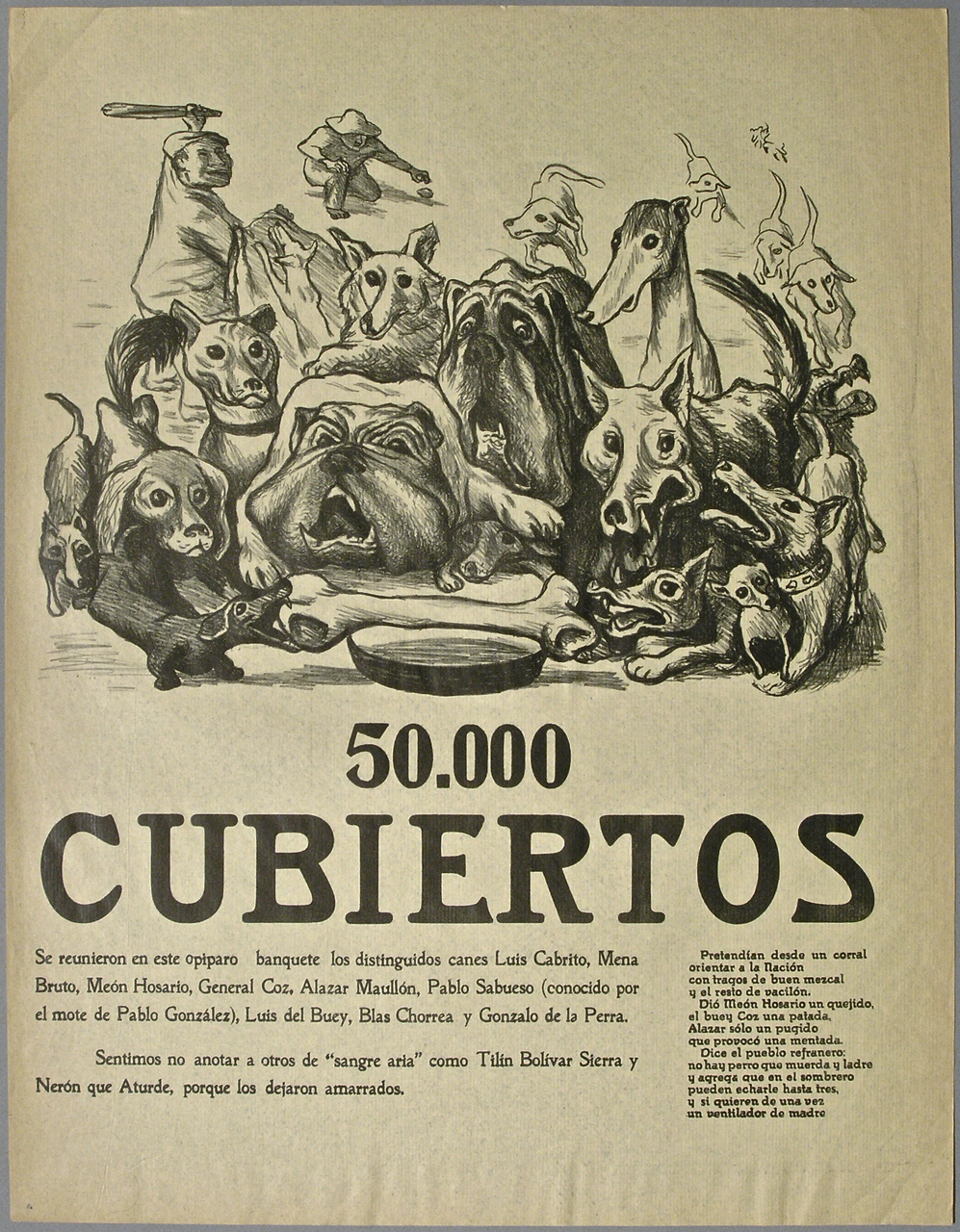 Description: A satirical poster which is somewhat cryptic, at least to my spanish. It mentions that 50,000 are covered and talks of a sumptuous banquet. Presumably a reference to those whose comfort comes at the expense of the less fortunate.The image shows a group of dogs fighting for a bone while being assailed from behind.