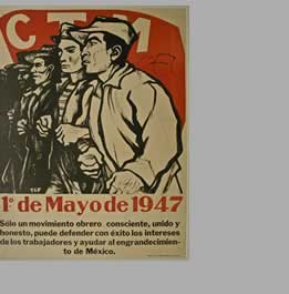 ROW ONE Leopoldo Méndez Title: "1 de Mayo. Elevar el nivel de vida del pueblo mexicano,..." Date: 1947 Medium: Linoleum cut in black and pink/red with type in pink/red. Edition: Unknown Inscriptions/Annotations: None Paper/impression quality: Excellent impression on typical poster paper. Image dimensions: 25.5" x 21.0" Sheet dimensions: 32.5" x 24.5" Prignitz number: 77 Reference:TGPpr, # 77, 317.TGPmus, 189. LMdc, 195.