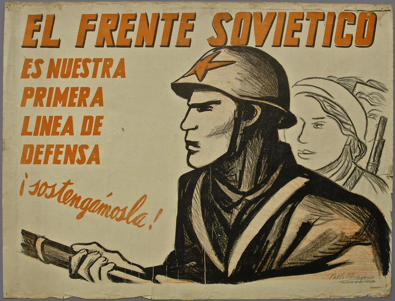 ROW TWO left and right, Pablo O'Higgins Title: El Frente Sovietico Date: 1941 Medium: Lithograph in orange and black with lettering drawn on/transferred to the stones. Edition: Reported to be 5,000 with 200 on better paper sold to defray printing costs. middle image, Isidoro Ocampo Title: El Fascismo 4a Date: 1939 Medium: Lithograph in black with type, possibly partially transferred to stone, in red. Edition: Reported to be 2,000. Inscriptions/Annotations: Initialed in stone at LR "I.O." |