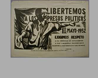 ROW ONE Alfredo Zalce Title:"1886 1 de Mayo-1849 Gran Mitin..." Date: 1949 Medium: Line cut reproduction of a drawing in black with type in black and red. Edition: Unknown Inscriptions/Annotations: None Paper/impression quality: Excellent impression on typical poster paper. Image dimensions: 19.0" x 15.9" Sheet dimensions: 37.5" x 27.9" Prignitz number: 101 Reference:TGPpr, # 101, 319. Leopoldo Méndez Title: Homenaje a Benito Juárez Date: 1947 Medium: Line cut reproduction of ink drawing with type. Edition: Unknown Inscriptions/Annotations: Signature of Méndez reproduced at LR of drawing. Paper/impression quality: Excellent impression on typical poster paper. Image dimensions: 22.2" x 17.5" Sheet dimensions: 32.2" x 24.2" Prignitz number: 75 Reference:TGPpr, # 75, 317.TGPdoce, 18. LMasu, 38. LMdc, 200. Andrea LL-Gómez, UR-Elizabeth Catlett, UL-Óscar Frías y LR-Mariana Yampolsky Title: Homenaje a Cárdenas Date: 1956 Medium: Four relief prints, presumably linoleum cuts, with type. Alberto Beltrán y Fanny Rabel (Rabinowitz) Title: Israel Pablo O'Higgins and Francisco Mora Title: IV Congresso de la CTAL Date: 1953 Medium: Linoleum cut in black and red with type in black. Edition: Unknown Inscriptions/Annotations: Paper/impression quality: Excellent impression on typical poster paper. Image dimensions: 25.1" x 26.2" Sheet dimensions: 37.6" x 27.7" Prignitz number: 157 Reference:TGPpr, # 157, 325.TGPmus, 192. Description:A promotional poster for the fourth congress of the CTAL (the Confederation of Latin American Workers.) Image shows workers, including a miner in the foreground, leading a parade for peace and national independence, presumably for Chile, where the conference is being held. |