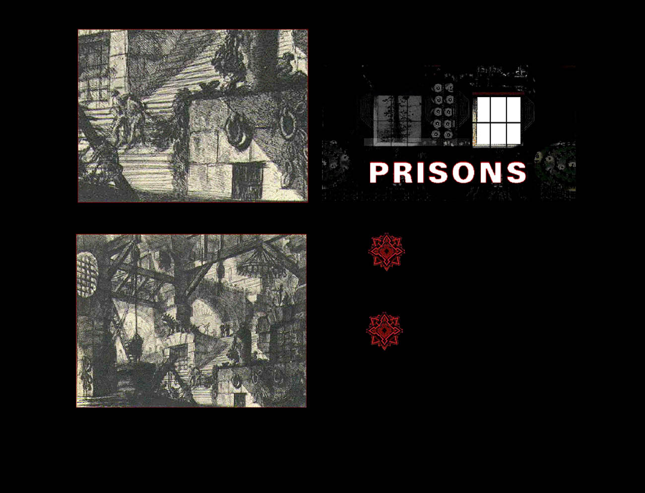 A small red door in the Theatre at floor level leads to a huge Labyrinth dedicated to Darkness from which Light hopes to be released. The Spectator gets increasingly pessimistic about the process as directional hands offer help getting around. Whenever this is selected, an unpleasant sound implies heavy footed treads and uncertainty. Mani described the Defeat of Good by Evil and the dispersal of the Light into fragments. The Labyrinth describes this condition in Moon, Stars, Torches and Human Souls kept in prisons, whether it be Dore's or Piranesi's. "When it's dark in Dover, it's Dark the World over..." Several factors conspire to extinguish Light, and Life. The Spectator moves with great difficulty and can never be guaranteed to have visited all the options in the Labyrinth. The Garden signifies clear and pleasing access to information. The Labyrinth presents the converse. It is difficult to get out. A huge metal machine grinds on with its mysterious purpose. |