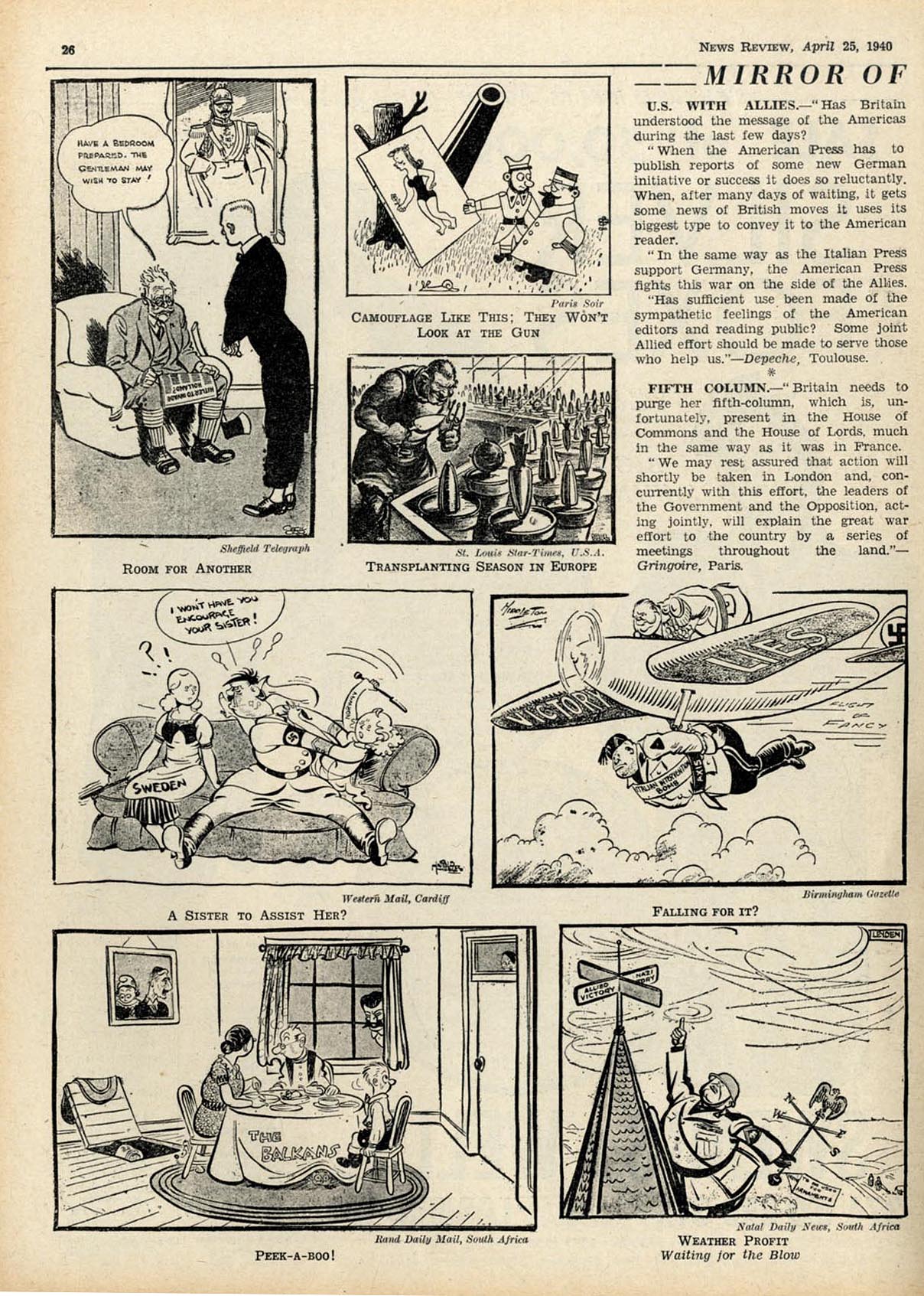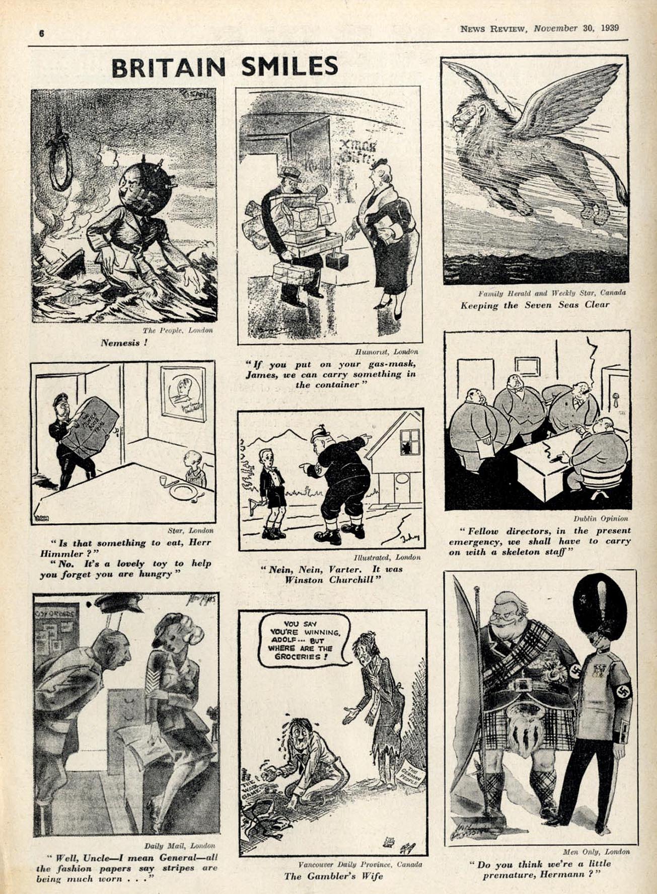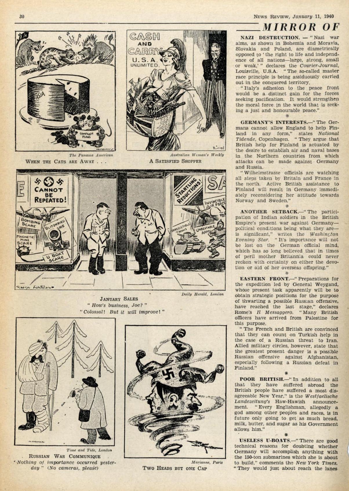 The News Review called itself "Britain's first newsmagazine". It modelled aspects of its design and even a certain shrillness of editorial comment on Henry Luce's TIME magazine. On these two screens I have assembled in chronological order, with hardly a week missing, its useful compilations of the way other magazines and newspapers were responding to increasingly ominous political developments after Munich. Sometimes it presented a survey of world imagery, sometimes just British publications.