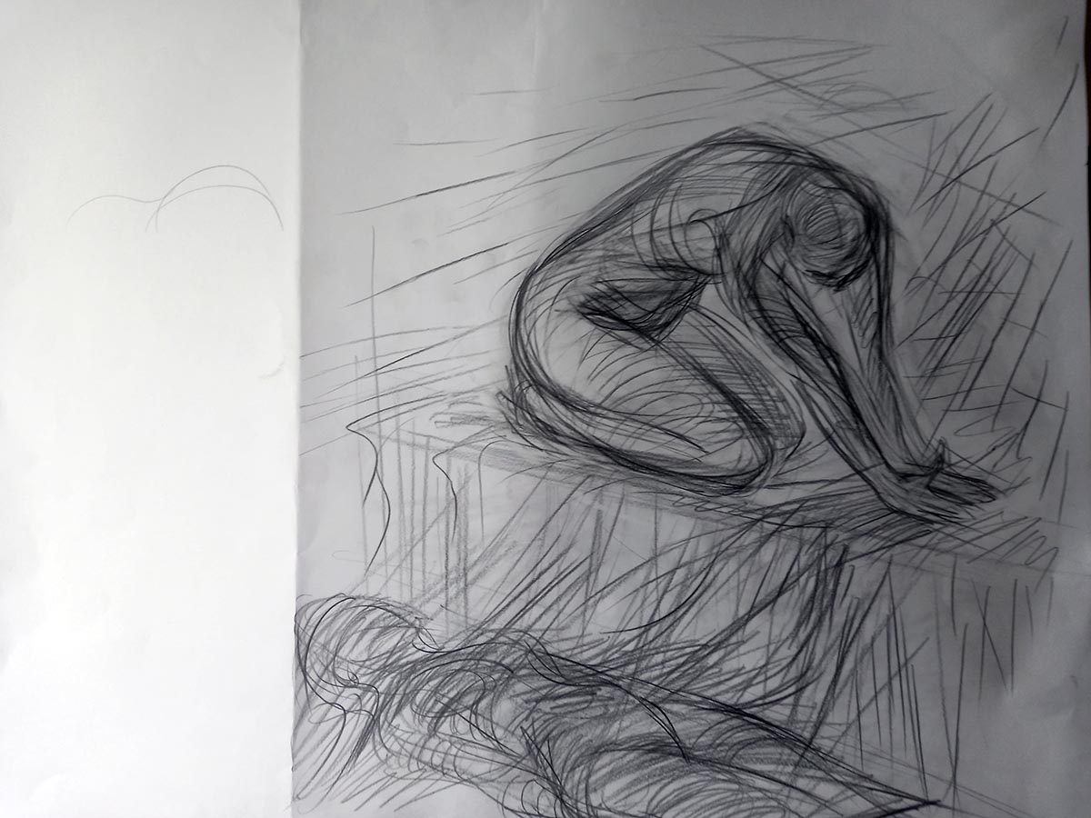On the drawing you see the female figure with a side of the palms of her hands scraping soil ,very neatly and in the best manner onto the grave where you can see the naked female corpse lying.