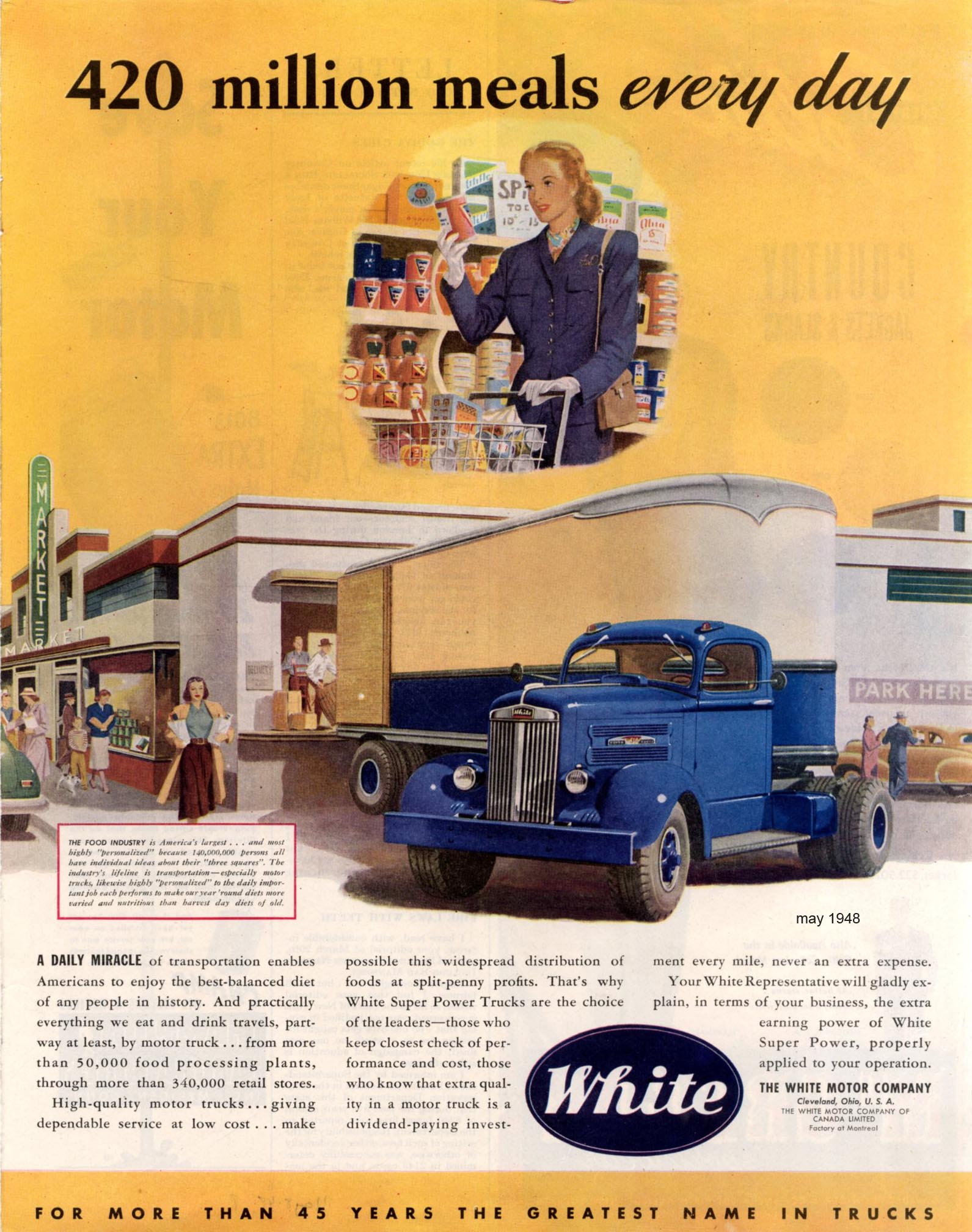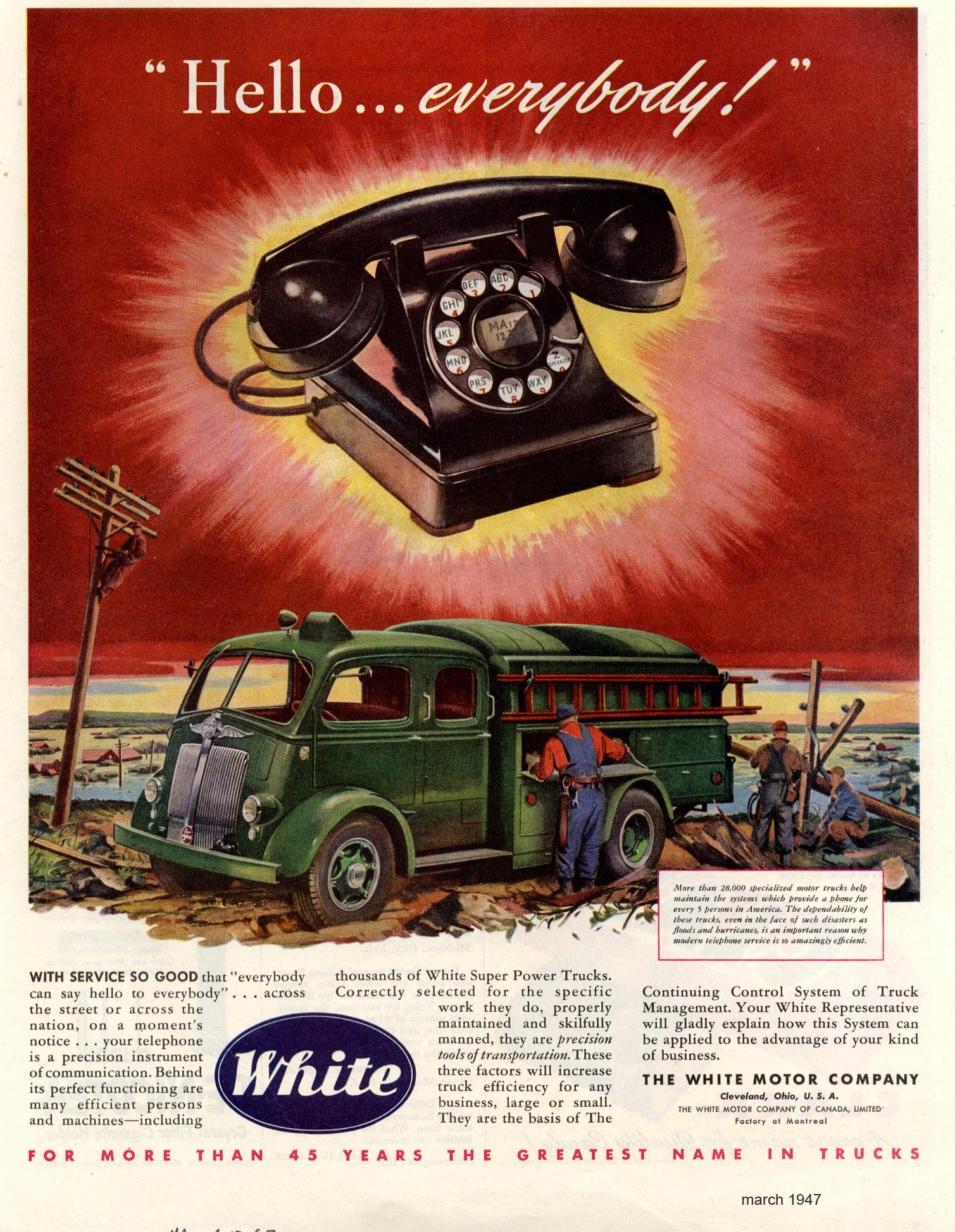 White align their trucks in a stately stasis, usually facing the left hand margin of the page. In repose, these mighty but gentle beasts dream while they are being loaded or adjusted - dream of unlikely things, telephones, road signs and a woman with a supermarket basket. Some dreams are star bursts, and sometimes a celestial vision of contentment with the traditional cloud support. Perhaps the argument is that the vehicles have earned their reverie. Only in Peter Helck's pictures do these beasts of the road barrel along the Freeway, a danger to every living soul (pace Speilberg's Duel). |