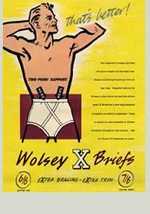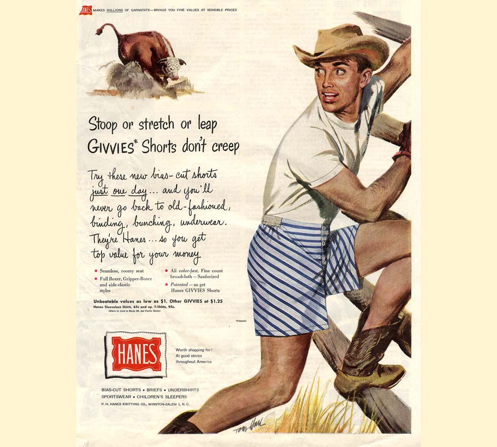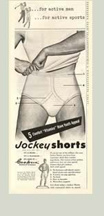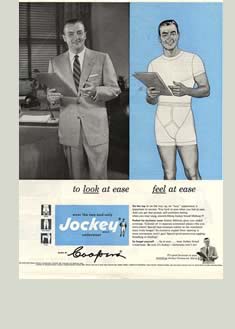 Textron January 1948, Jockey Shortsc1955, Durene March 1956; Hanes April 1950; Wolsey briefs c1955; Jockey Shorts June 1948; Fruit of the Loom June 1957; Jockey April 1953; Healthknit June 1957; Jockey June 1950; Fig Leaf Brief June 1950.