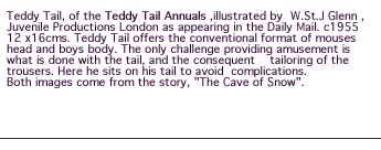 Teddy Tail, of the Teddy Tail Annuals, illustrated by W.St.J Glenn, Juvenile Productions London as appearing in the Daily Mail. c1955 12 x16cms. Teddy Tail offers the conventional format of mouses head and boys body. The only challenge providing amusement is what is done with the tail, and the consequent tailoring of the trousers. Here he sits on his tail to avoid complications.