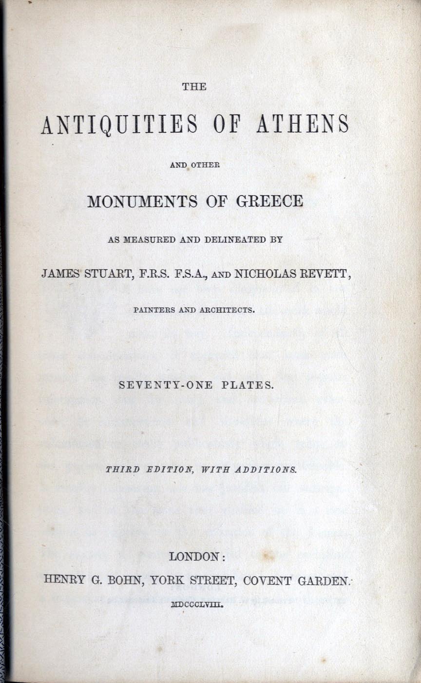 First published in 1762, the Antiquites was a grand publication , but I am tender towards this brave if pallid version if it, with much fruity foxing, the Bohn edition of 1858.