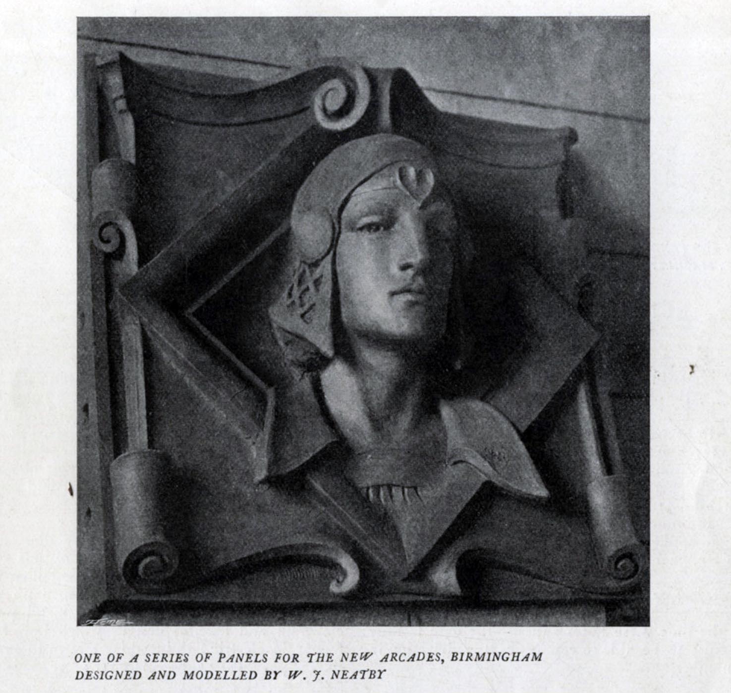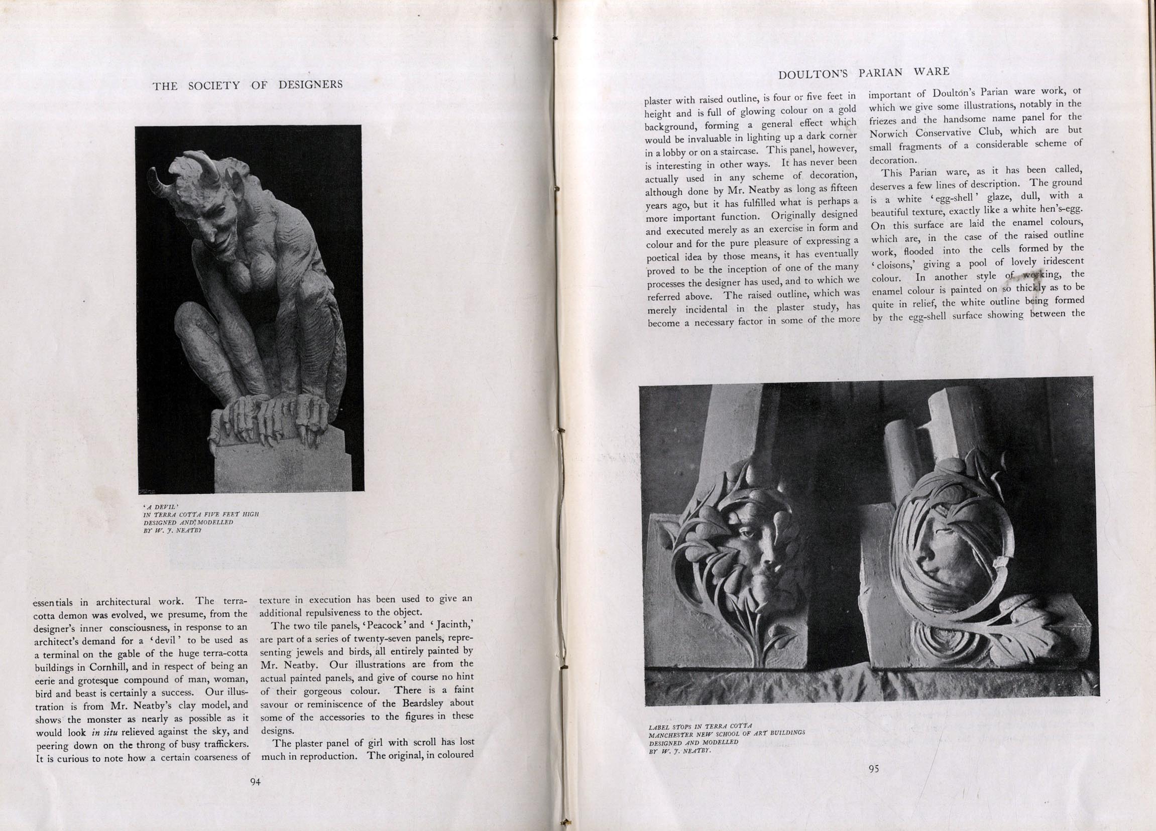 W.J.Neatby (1860-1910) still lacks rigorous scholarship applied to his considerable achievements working with Doultons of London and particularly in the embellishments of Buildings in major English cities . I have long admired his decorative work for George Skipper's Royal Arcade in Norwich.He had his weaknesses in female profiles and apects of fiugure drawing, but his invention of decorative forms that sat on the architectural structures in pubs, theatres, shops and shopping arcades is second to none.