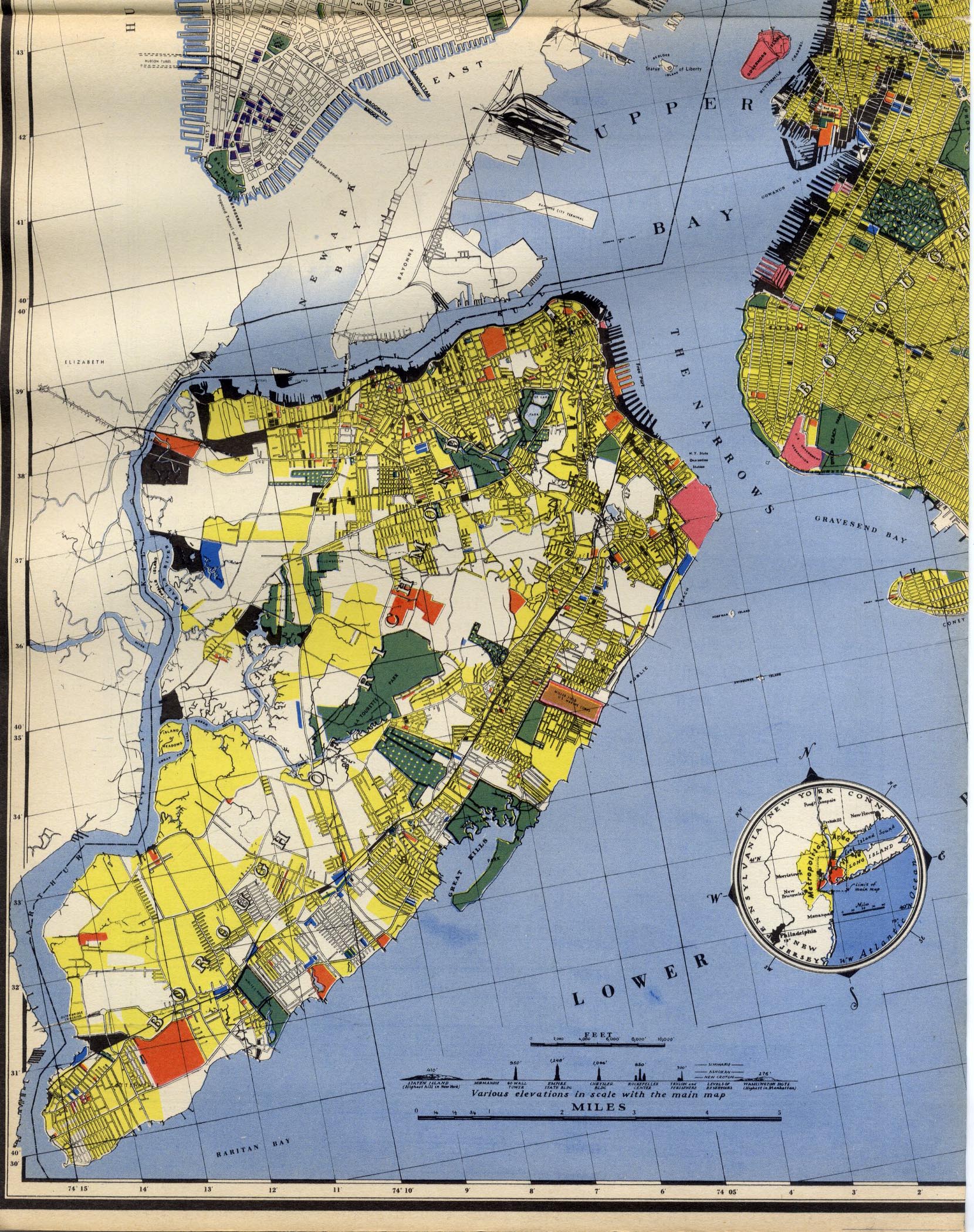 I had taken my copy of the huge July 1939 issue of FORTUNE to the party given by the Burcks. Ricki Harrison beamed with a sort of dry delight, and showed me small maverick inscriptions he had secreted into the map. "Proposed Lindenthal Briidge under obstruction (sic) ...." - "NB" he wrote with arrow and then added his own signature in ink, upper left. Look at this detail, if only to see the graphic precision of a map that measures 29 x 40 cms by four. It is a magnificent spectacle.