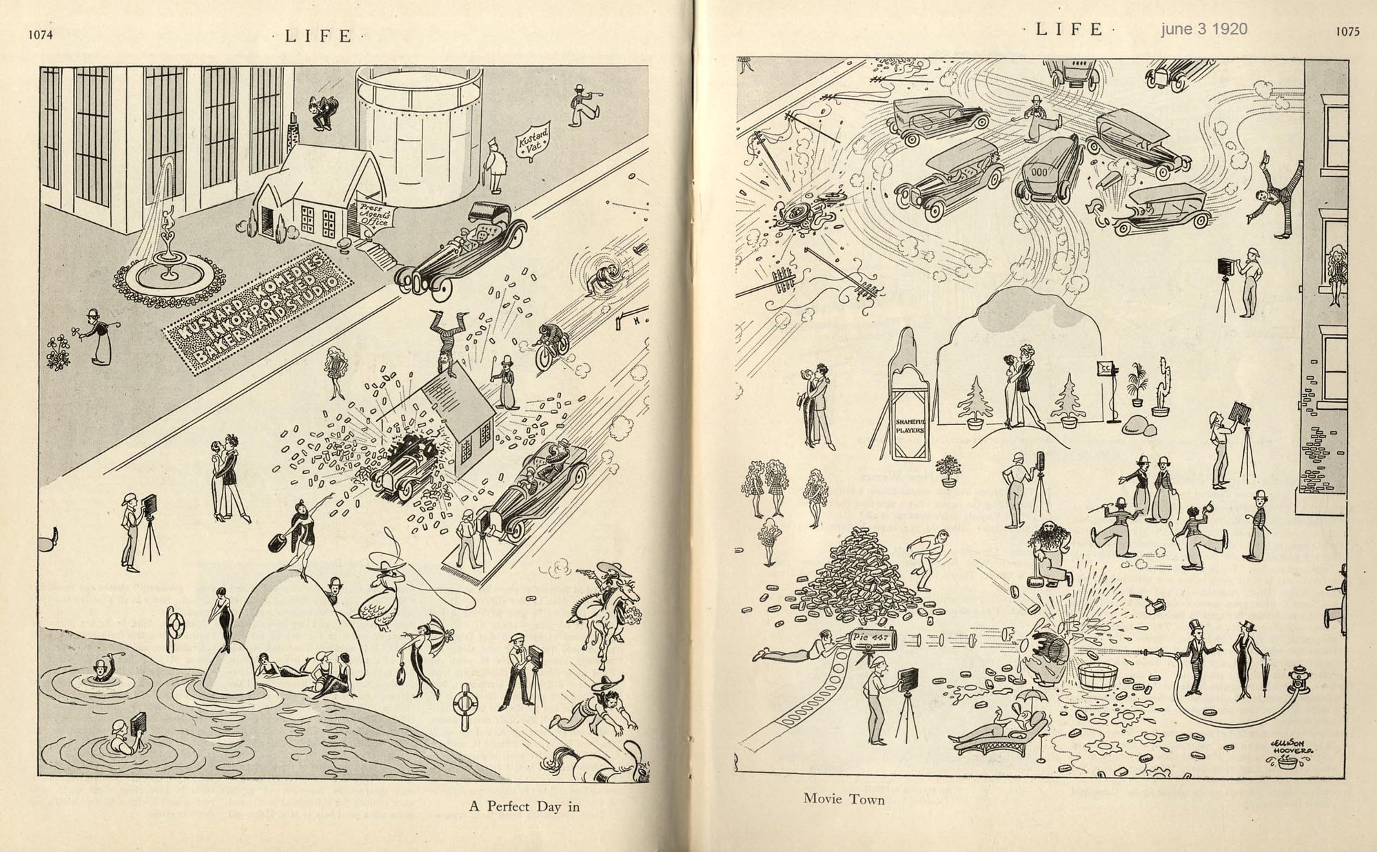 | The year of 1920 is sufficiently early to provide an interesting insite into public attitudes to what they were offered by the Film Companies. The spoof silent film, with ridicule at the melodramatic plot lines is common to both LIFE and The Passing Show. See also Rea Irvin's cover of the Hero saving the Heroine.Artists represented above include Harrison Cady and Ellison Hoover |
