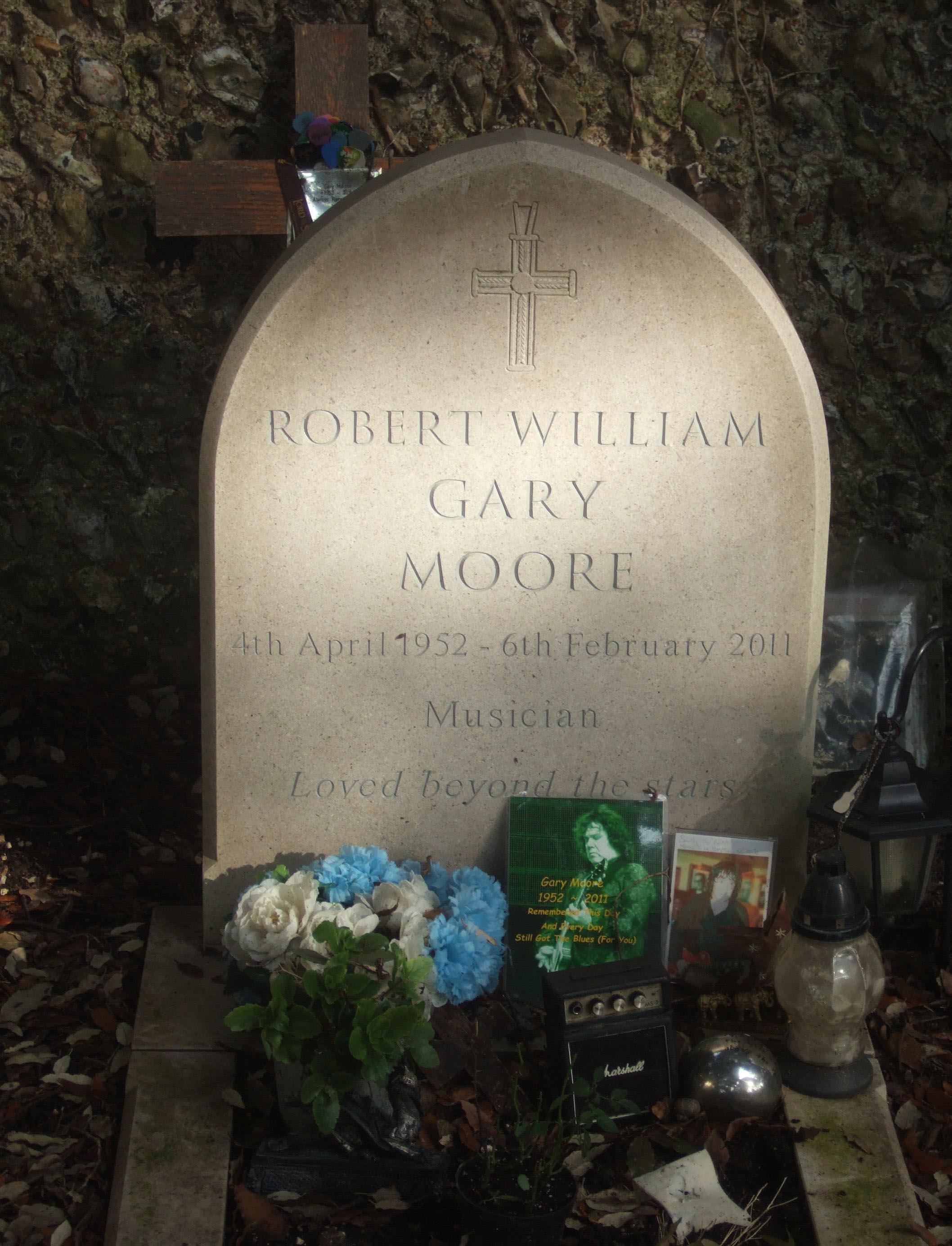 | Show Business is well represented in the Graveyard - not one but two Coon Singers from the Music Hall. Jimmy Noon is not the American Swing Band Leader but the regular organist at Butlin's Ocean View Hotel. Nimrod Ping was a local gay Activist. Gary Moore's plot is a remarkable evocation of his career with Thin Lizzy, with a tiny wet amplifier among the weeds. |