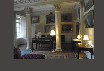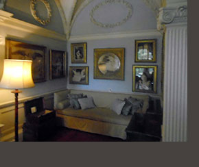 Teased into the best of moods by the presence of a decent lodge guarding the drive to the property, my mood soon deteriorated because of several factors. Somewhere a wedding was gathering. On the front lawn a parade of classic cars was attracting several variations on Toad of Toad Hall, "Poop Poop!". I was half in pursuit of two paintings by Fred Leighton. Teasing one guide about the gloom in the major galleries, it was clear that visitors regularly complained about the absence of light, and the impossibility of seeing any of the decent collection. I was offered a hand torch with which to explore the Richard Wilson, but the Leighton was skied and only a vestige of its masterly melancholia could be appreciated from beneath. Because I purported to be an art historian (with great difficulty these days) the Chief Attendant turned on the Chandelier while I studied it. The David Teniers Cottage Interior would have been impenetrable even under a searchlight trained directly on its darkened varnish. What most disturbed me was entering the Stourhead experience through a sliced reproduction of a Claudian landscape (top row). I remembered my favourite instance of the destruction of Art. Inviting the public to see a recently commissioned giant canvas of a mythological scene , the painter Peter Cornelius was dissatisfied with the critical response around him and made his exit through the canvas itself at top speed, disappearing into the distance. I did the same as I left Stourhead. |