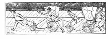 03 Danse de la Toilette, from LIFE magazine March 1920. 04 "Seaside Sports". Punch August 6th 1898 p.57; 5 x 17cms, by Starr Wood. 05 a circus poster 1891/2, 55 x 72 cms containing some well juxtaposed images of stately performing on the machine - this was the age of the novelty bicycle act, made the more charged by it being a female performer - a Female Mazeppa as the act was often called. 06 "Sketches of MP's whose seats have been re-distributed. Punch June 2nd 1866 p236 12 x 17cms, unsigned. 07 E.Jeffrey's pictures of the character Toby Twirl hiding under the bed. Toby Twirl Adventures , Sampson, Low, Marston, London 1958