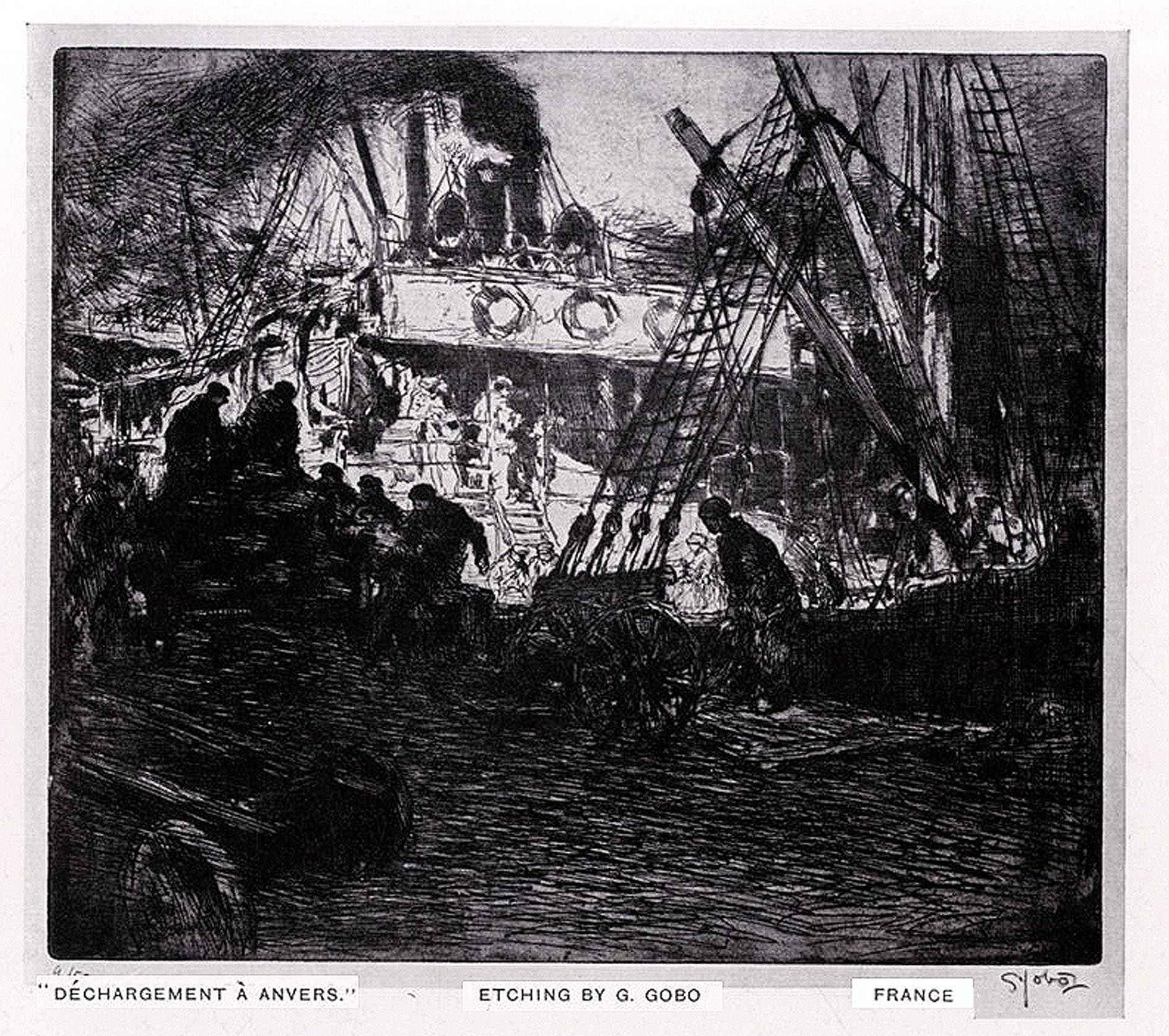 Row One, Shaw MacLaughlan, The Cypress Grove (US) ; B.J. Nordfeldt,Gas Tank Town, Chicago;Pennell, New and Old Rome; George Plowman Cloth Fair, Smithfield; WF.W.Raymond, Chicago. Row Two H.Webster, Vieielles Maisons; Webster, Sur La Quai, Montebello; A.Lepare La Petite Mare; L.Kasimir, Hof Wien ; L.Michelek, Construction of a Tunnel Row Three, Bejot, Le Pont Royal; M.Bauer, jerusalem; G.Gobo, Disembarking at Anvers Row Four, W.Witsen, Amsterdam in the Snow; T.F.Simon, Prague in the Snow.