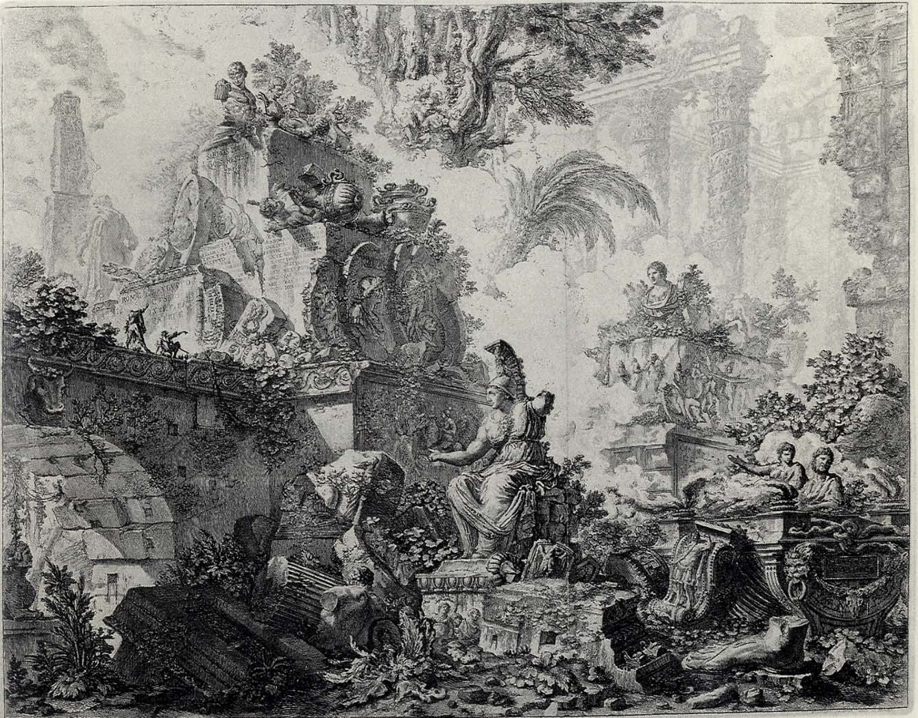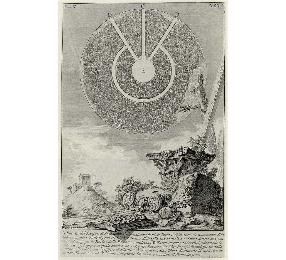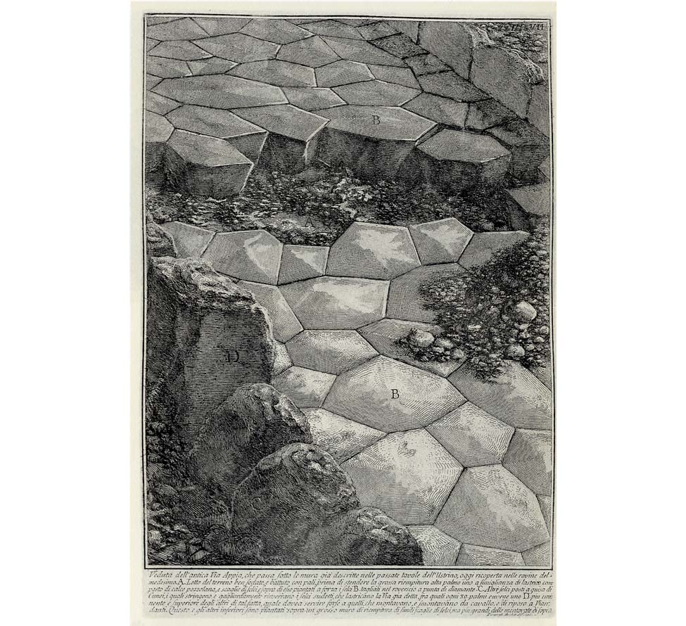 These selections try to reflect Piranesi astonishing graphic invention, being freshly minted ways of conveying information in ways that avoid the cliché and the expected. With such heaps of rocks, rubble and inscriptions at his disposal it is not just his great ability in representing scale that carries the day but also his use of lettering, visual puns,with unremitting textures with sudden changes and contrasts. Every image has some new challenge to the material, to the graphic mode chosen, and usually to the restraining influence of the frame itself. A particular favourite is the little known guide to the various nozzle sizes in the flow of water. ROW A 01 The Smoking Fire from 'Carcer'i series ; 02 The Letter V from the 'Ornamental Graphics' set; 03 The Grand Piazza from 'Carceri' series ROW B 01 Frontespiece to' Vedute di Roma'; 02' Le Antichite Romane II', Plan of the Tomb of Alexander Severus; 03 Frontespiece to 'Le Antichita Romane', the intersection of the Via Appia and the Via Ardeatina; ROW C 01 'Le Antichite Romane IV', entrance to the upper room of a mausoleum; 02 'Le Antichite Romane III', the Via Appia Antica, road surface;03 nozzles and nmeasures for the regulation of water from'Ruins of the Fountainhead' 1761 ROW D 01 Vignette 'Work conquers all', from' Lapides Capitoline' 1761 02 the emissarium of Lake Albano ; 03 How the drums of a column are connected, from 'The Trophy' c1774. |